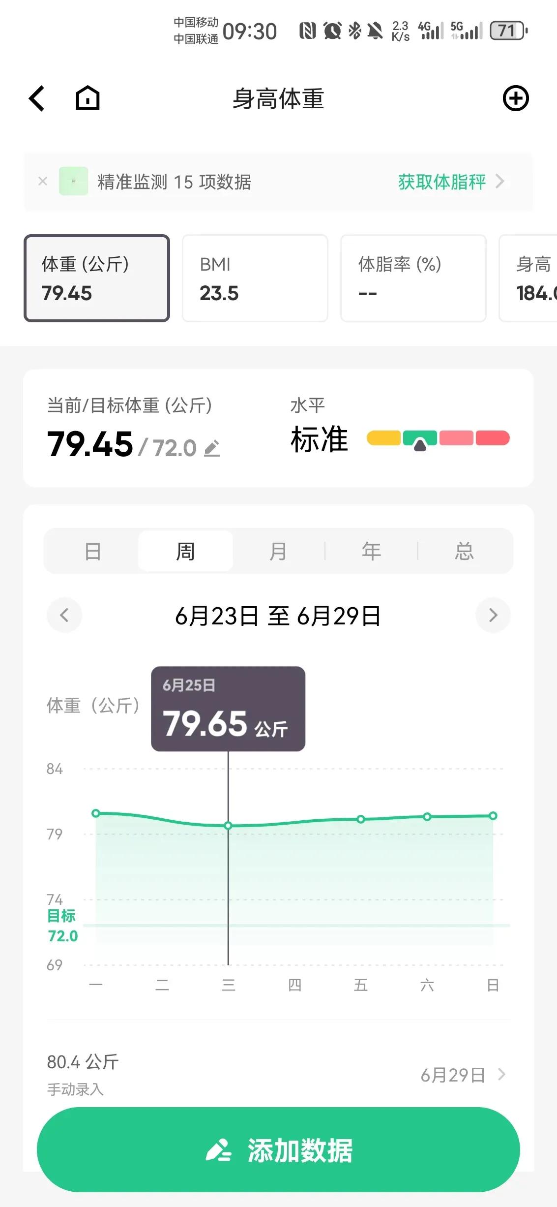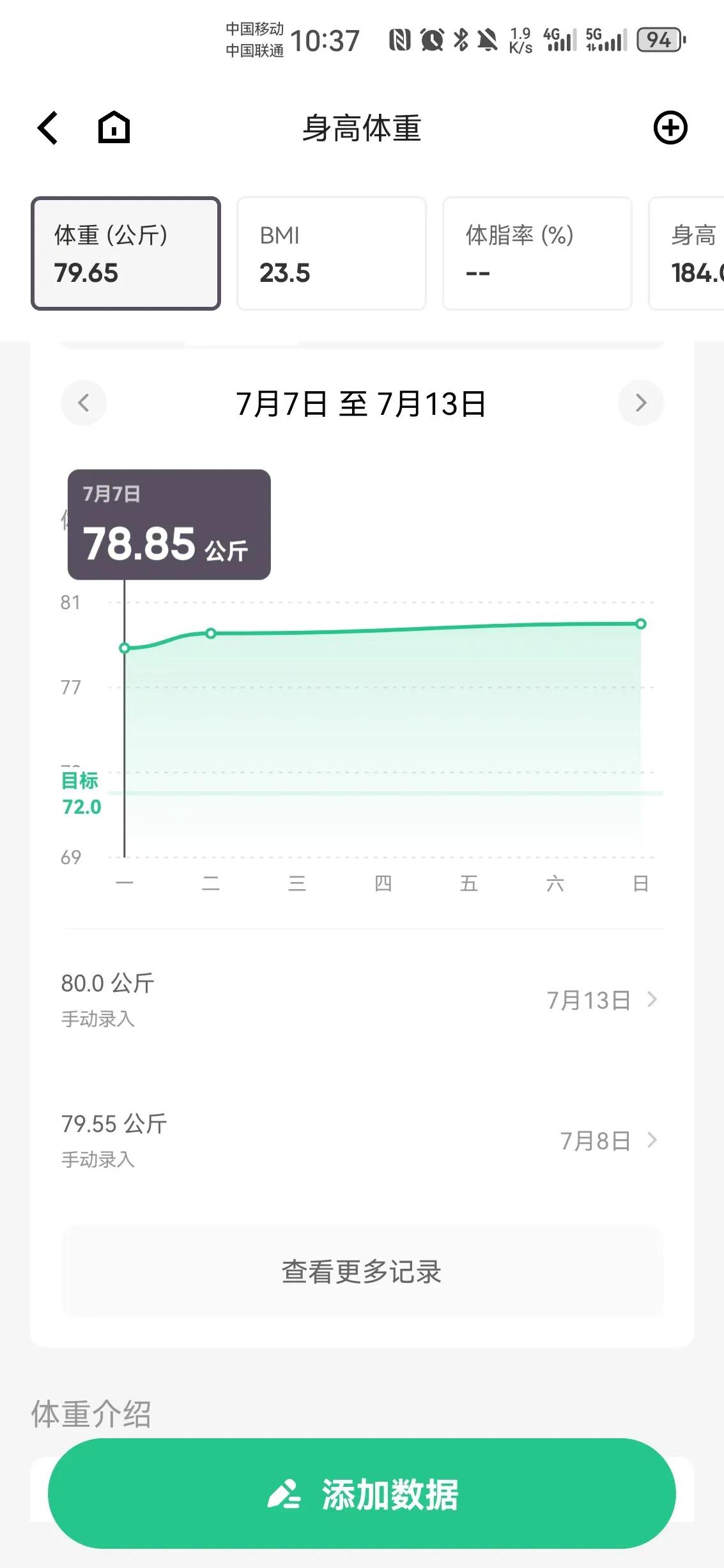 调整后平台期立马破开,每周掉1.5公斤,50天从85.4公斤降到78公斤左右。BMI从偏胖回到正常。