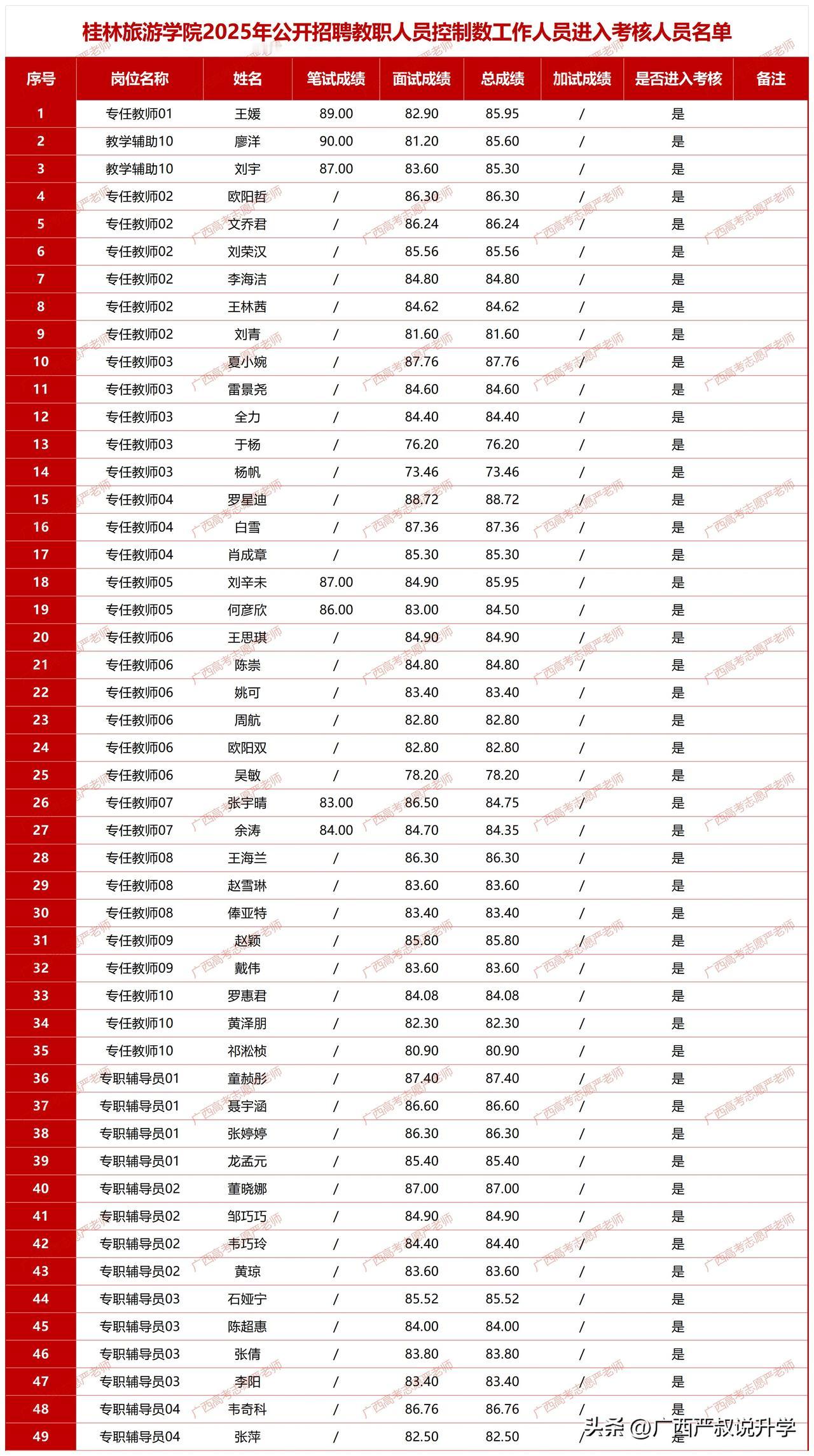 桂林旅游学院2025年公开招聘教职人员控制数工作人员进入考核人员名单——