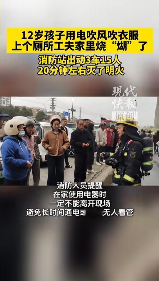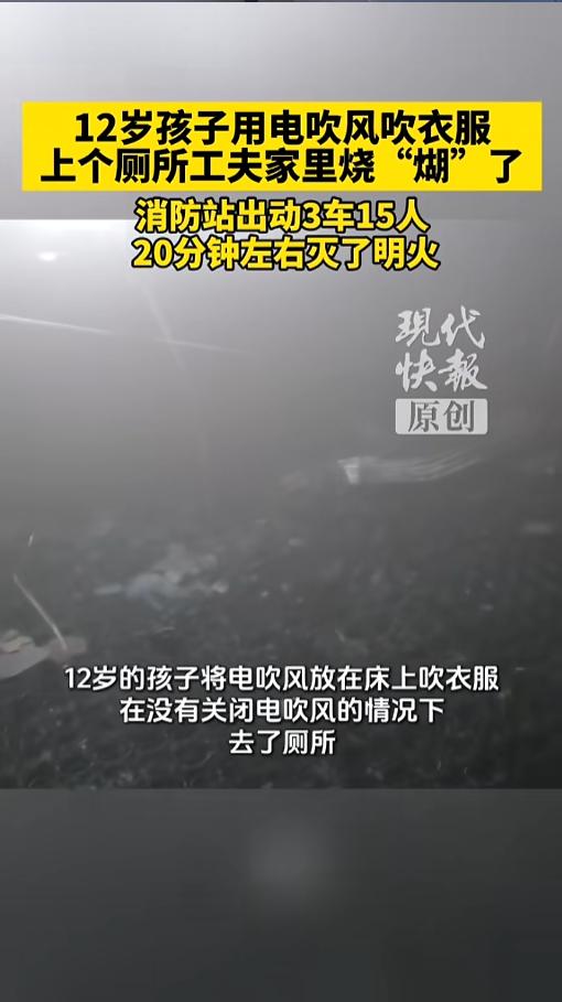 信息来源:《12岁孩子用电吹风吹衣服,上个厕所工夫家里烧“煳”了》现代快报