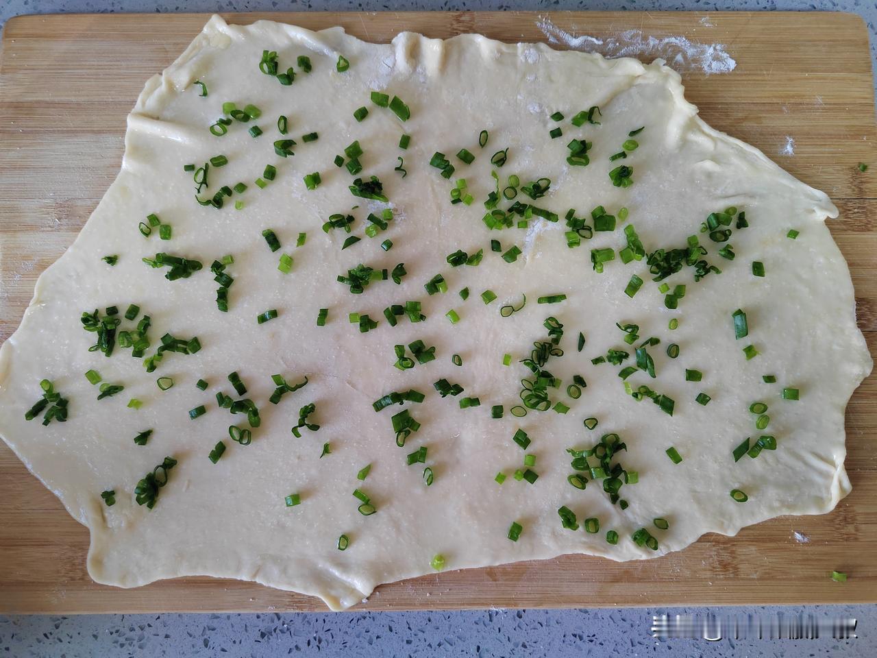 切割至合适面剂,擀平加清油、食盐、葱花,卷起后切块,擀平下热油锅,饼皮鼓起即熟。