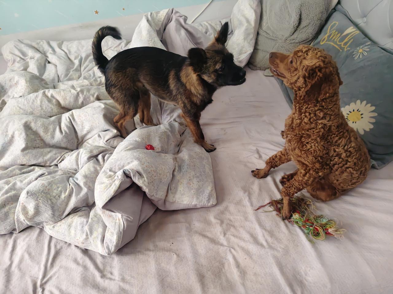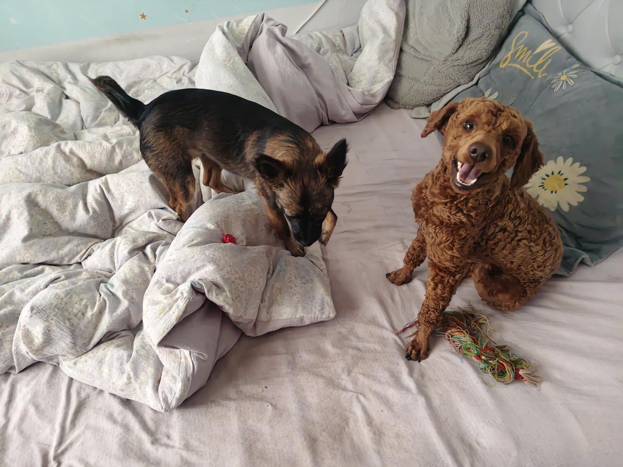 我家两狗子小七和豆豆,一个社牛,一个社恐。