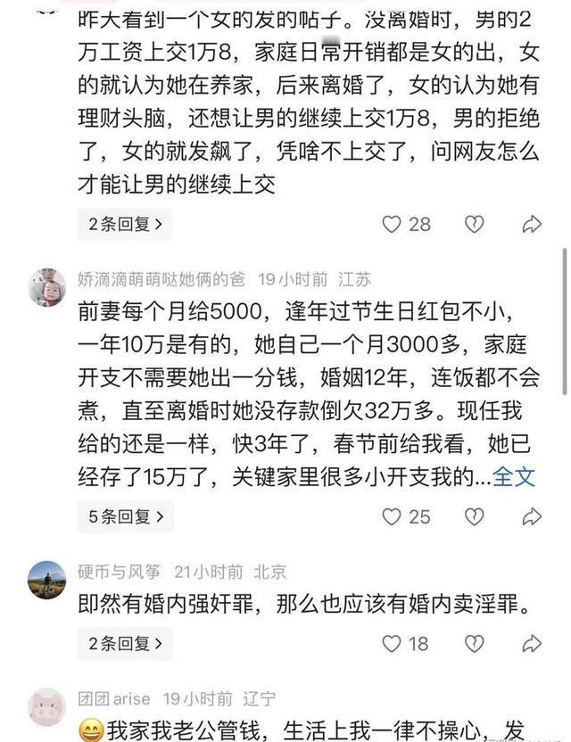更扎心的是后续跟帖:离婚后女方仍要求前夫继续上交工资,理直气壮质问“凭什么不上交”。这种将伴侣视为永久提款机的思维,彻底暴露了婚姻观念中的自私与傲慢。爱情不是绑架,婚姻不是剥削,当付出成为单方面义务,谁还愿意跳进这座围城?
