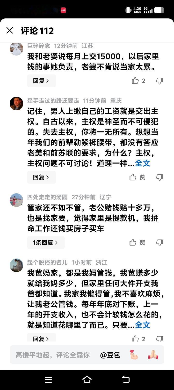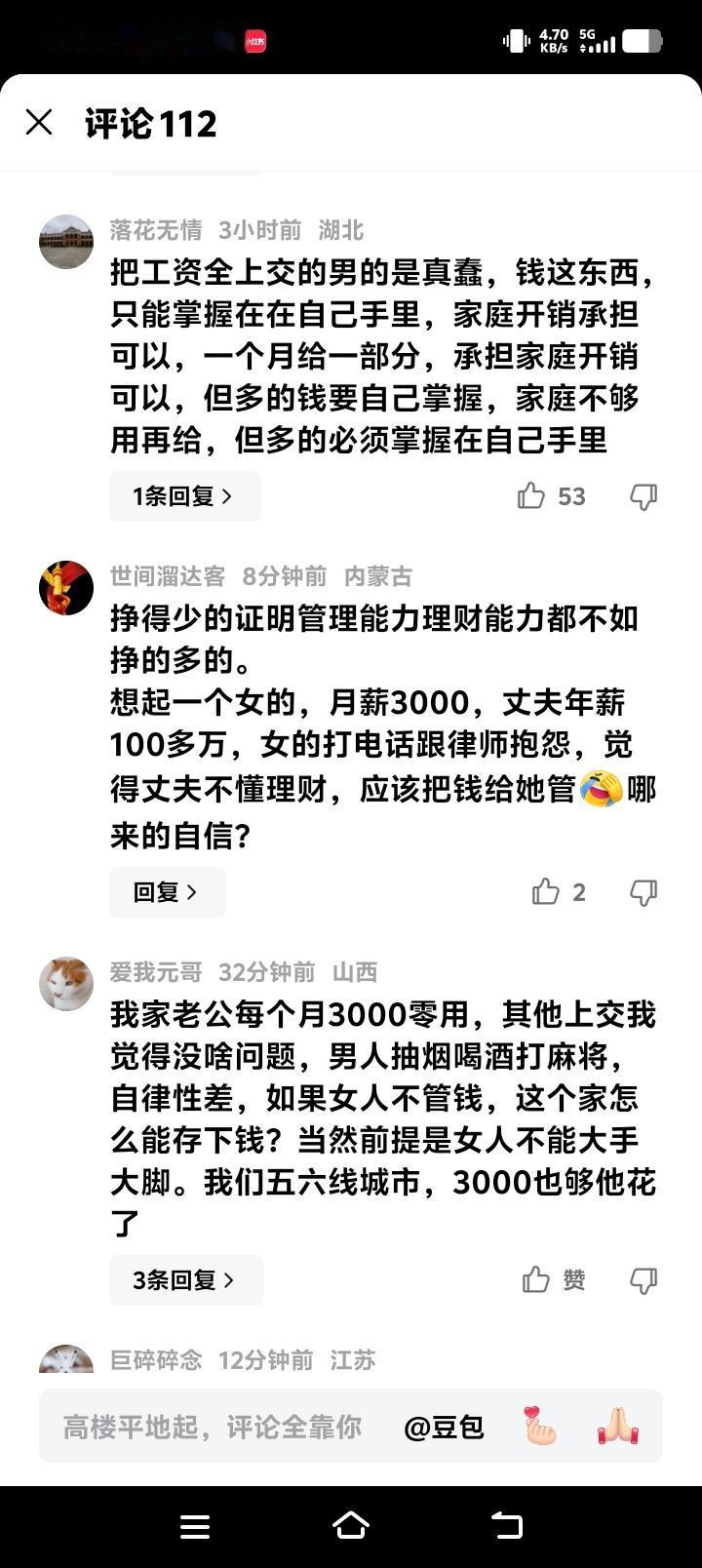 评论区一位男士的感慨引发共鸣:“钱是英雄胆,男人没钱还是男人吗?”话虽直白,却戳中无数男性的隐痛。在传统观念中,男人被期待承担经济支柱的角色,但如今,这种承担却可能异化为全方位的剥夺——工资上交、消费报备、尊严扫地。