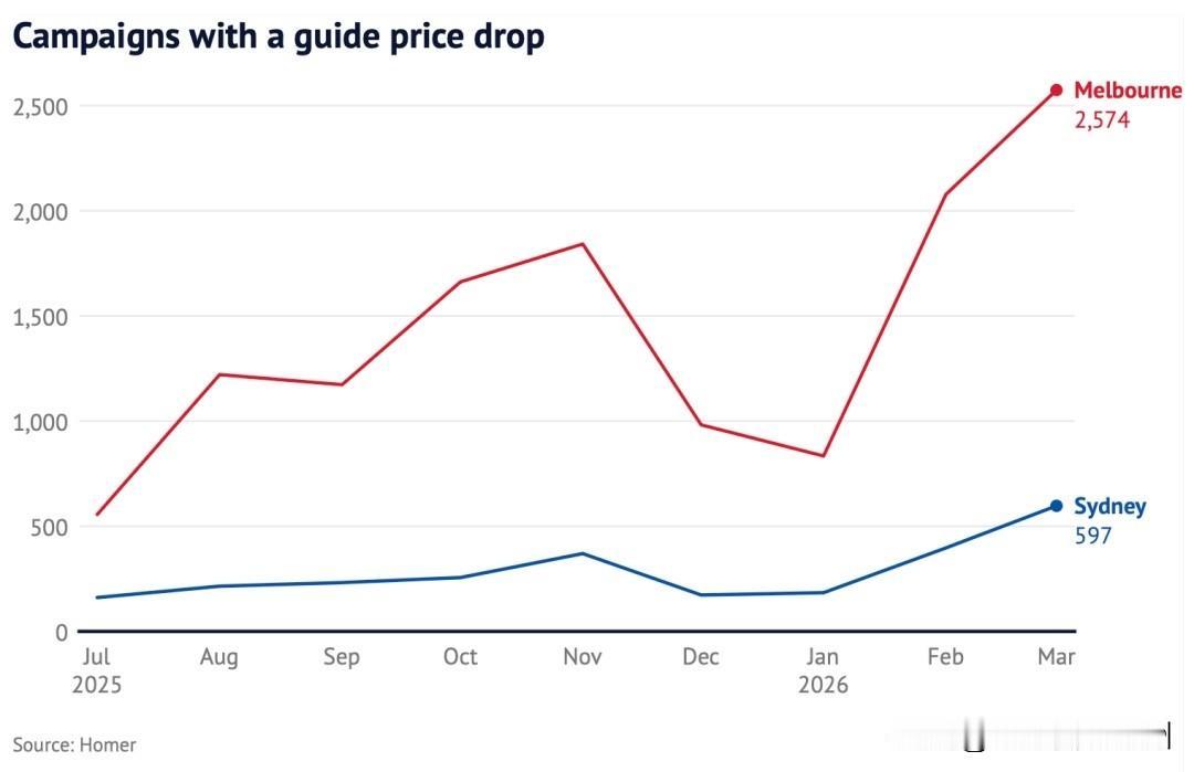 悉尼方面,3月有597套房源下调价格指引,2月为397套。同比去年10月至11月增幅更是达到59%。