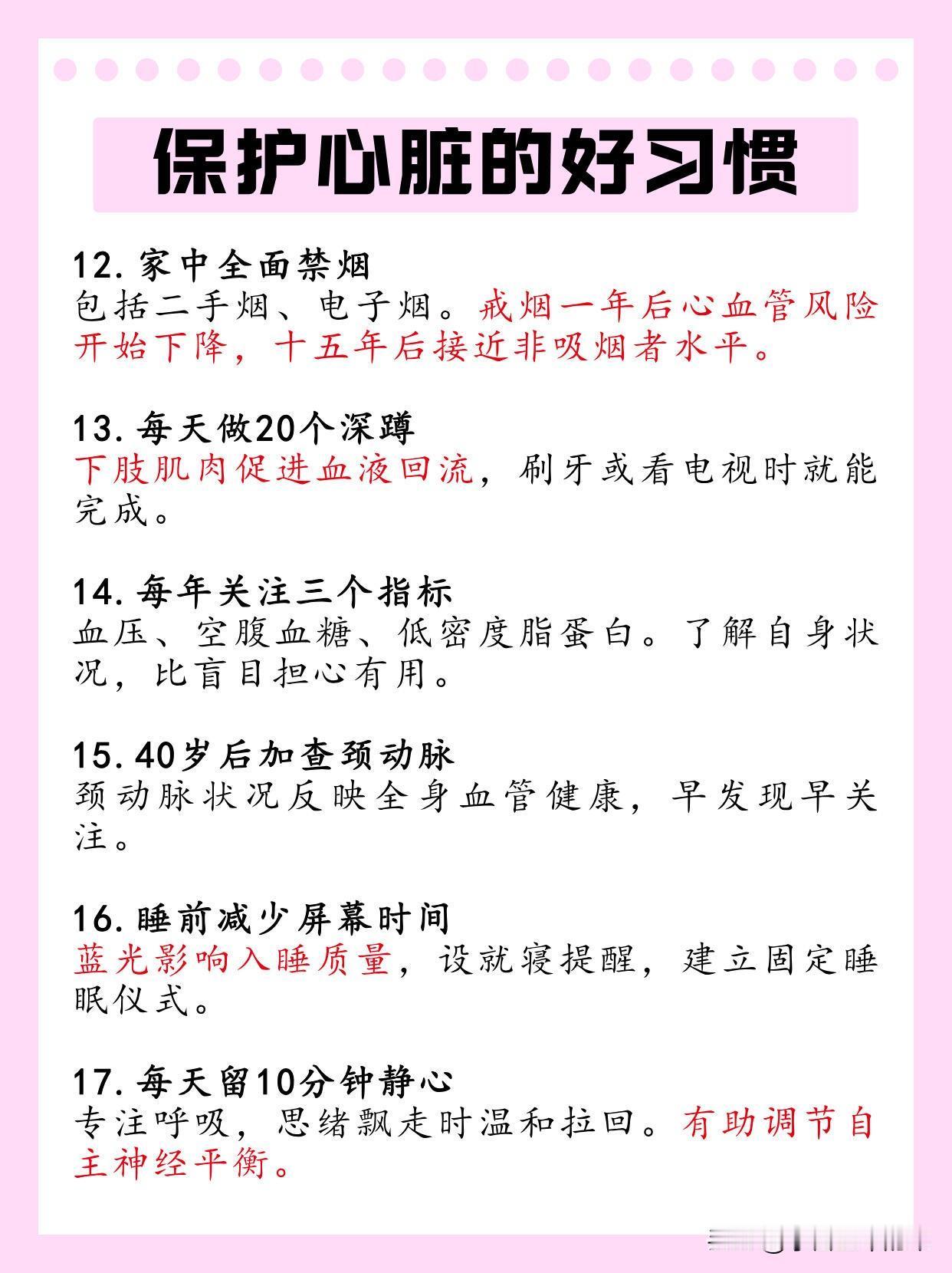 每年重点监测血压、空腹血糖、低密度脂蛋白,40岁后加查颈动脉;家中全面禁烟,戒烟一年后心血管风险即下降。这些小事坚持下来,就能给心脏最长久的守护。