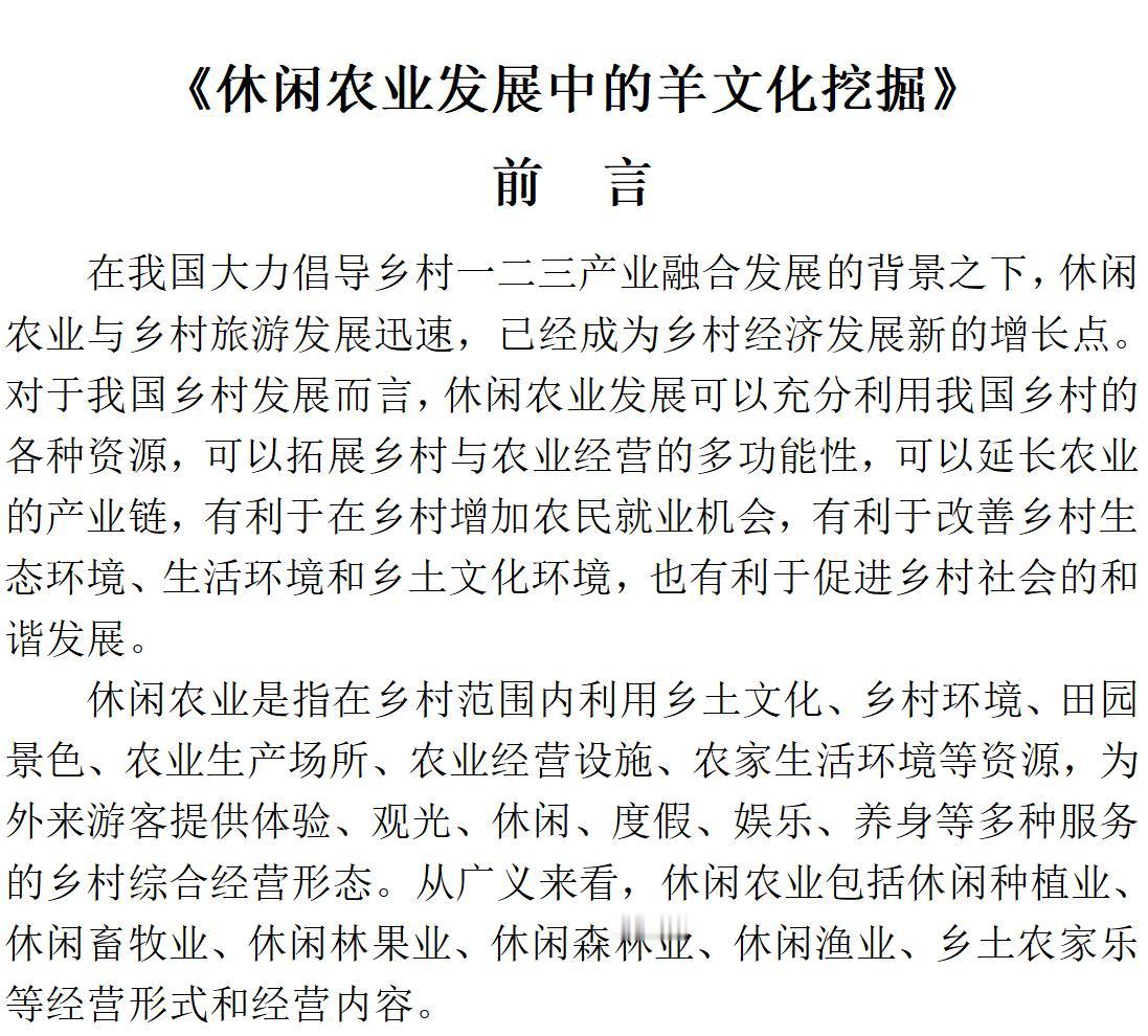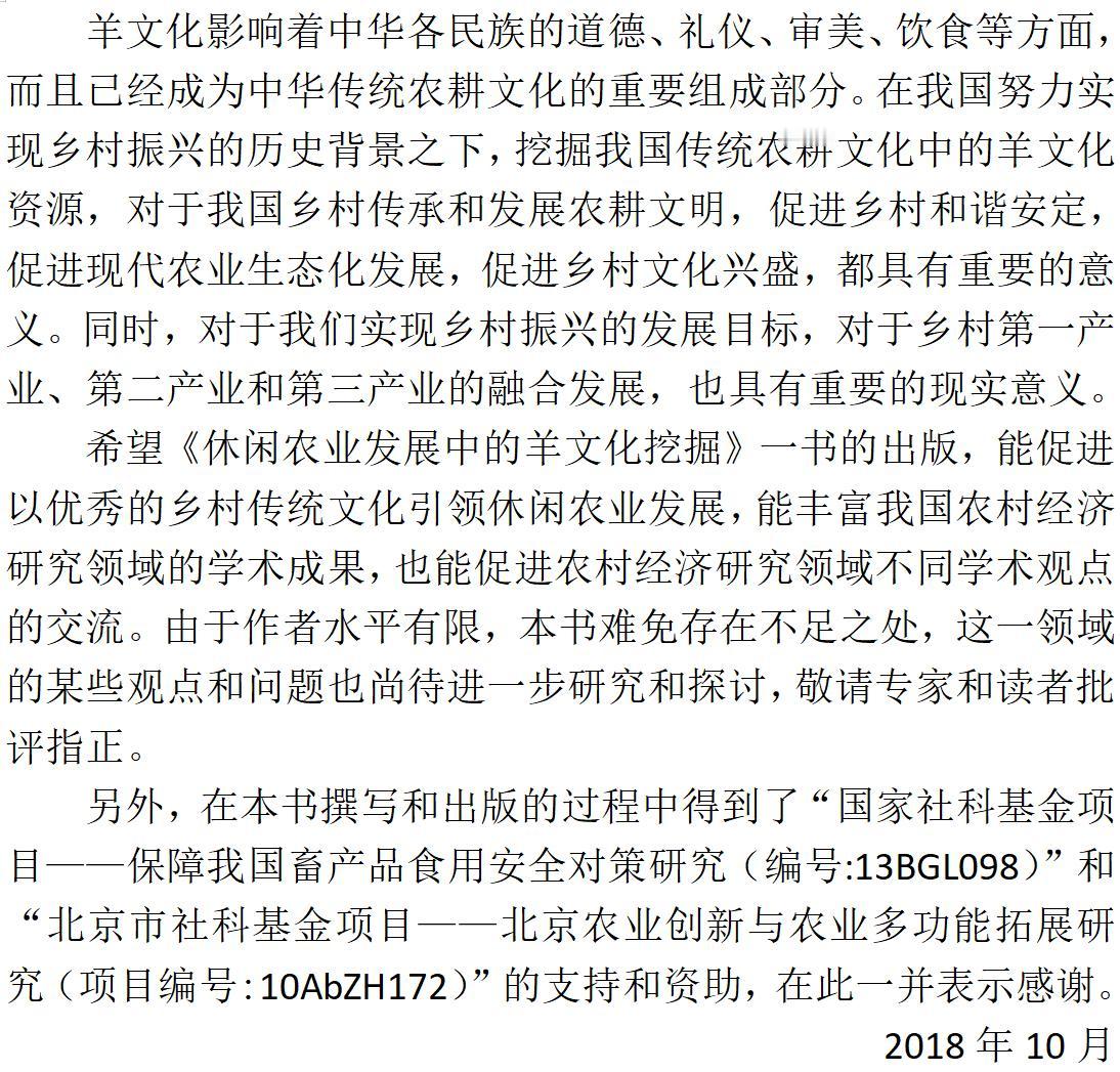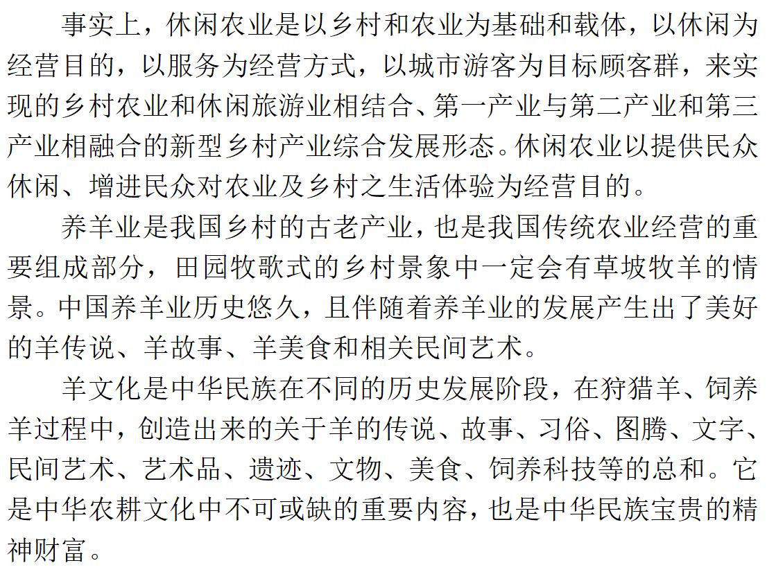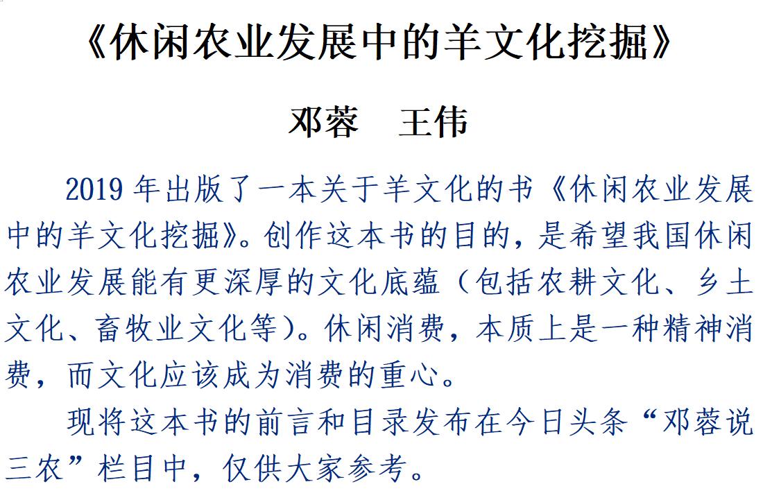 2019年出版了一本关于羊文化的书《休闲农业发展中的羊文化挖掘》。创作这本书的目的,是希望我国休闲农业发展能有更深厚的文化底蕴(包括农耕文化、乡土文化、畜牧业文化等)。休闲消费,本质上是一种精神消费,而文化应该成为消费的重心。