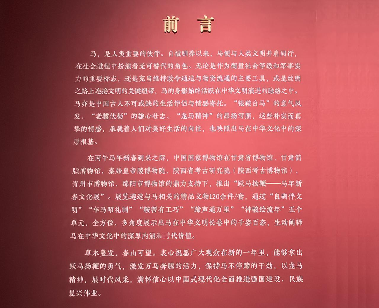 “跃马扬鞭——马年新春文化展”在中国国家博物馆展出,展览展示了与马相关的文物120余件(套),多角度展示了马在中华文明发展中的千姿百态,阐释马在中华文化中的深厚内涵和时代价值。