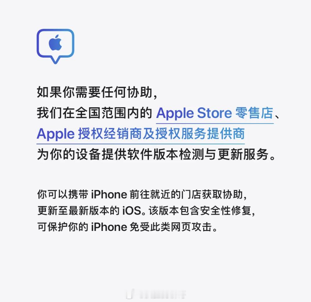 苹果官方发文提醒 苹果这次慌了,有安全研究人员发现,过时版本的 iOS 存在网页攻击漏洞,可以通过网页直接入侵你的手机,你的 iPhone,更新了吗?