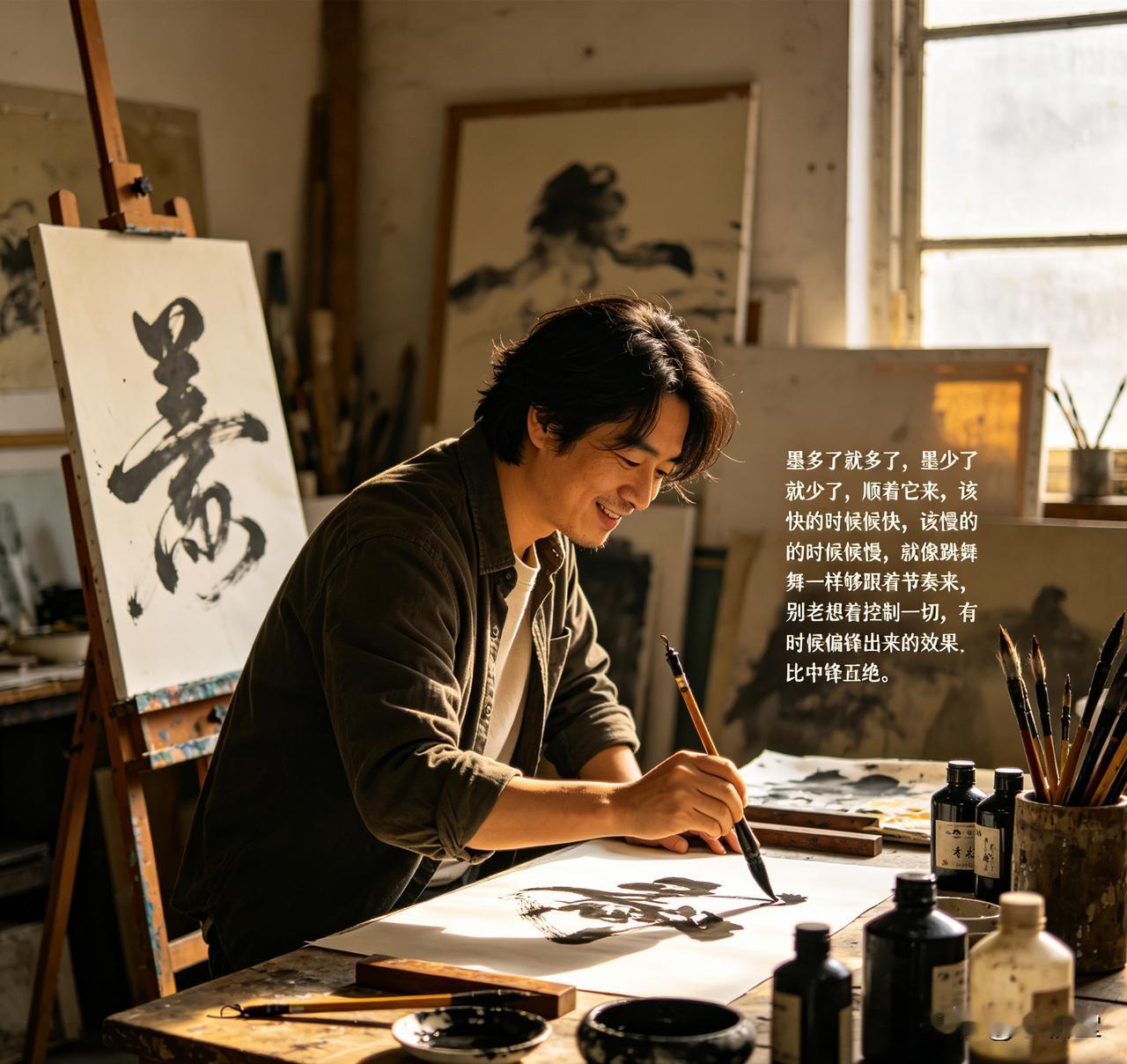 墨多了就顺着它写浓墨,墨少了就写枯笔,该快则快、该慢则慢,像跳舞跟节奏一样。别老想着控制一切,有时候偏锋的效果,比中锋还绝!