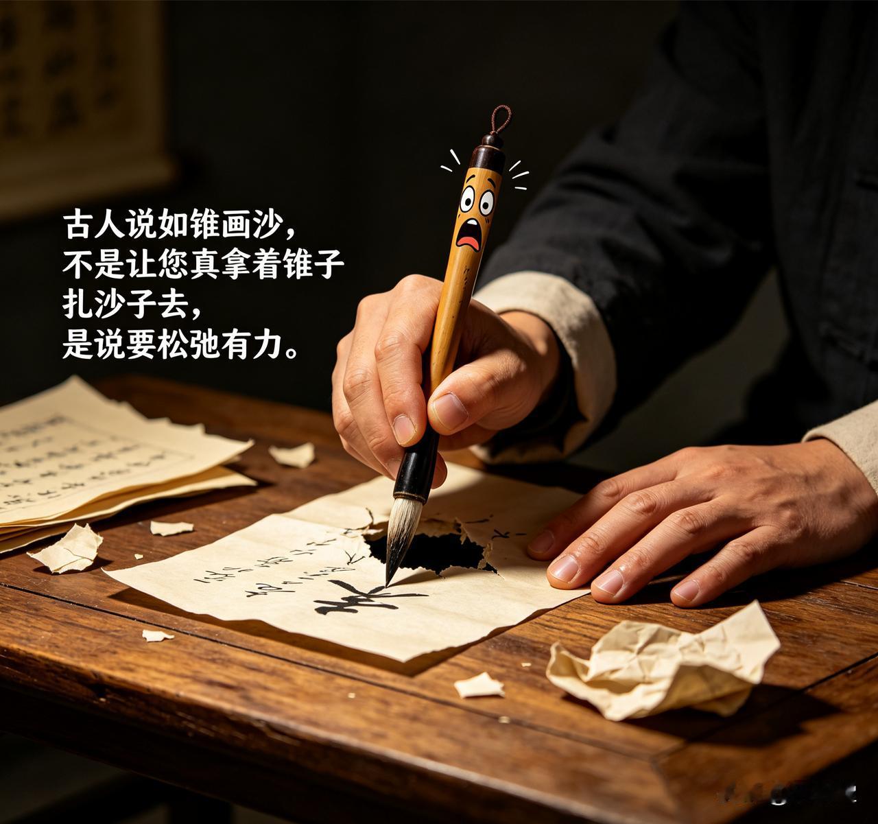 古人说“如锥画沙”,不是让你拿锥子硬扎沙子,而是要松弛有力。沙子软、锥子尖,用蛮力哪行?毛笔同理,意思到了就行,别暴力。