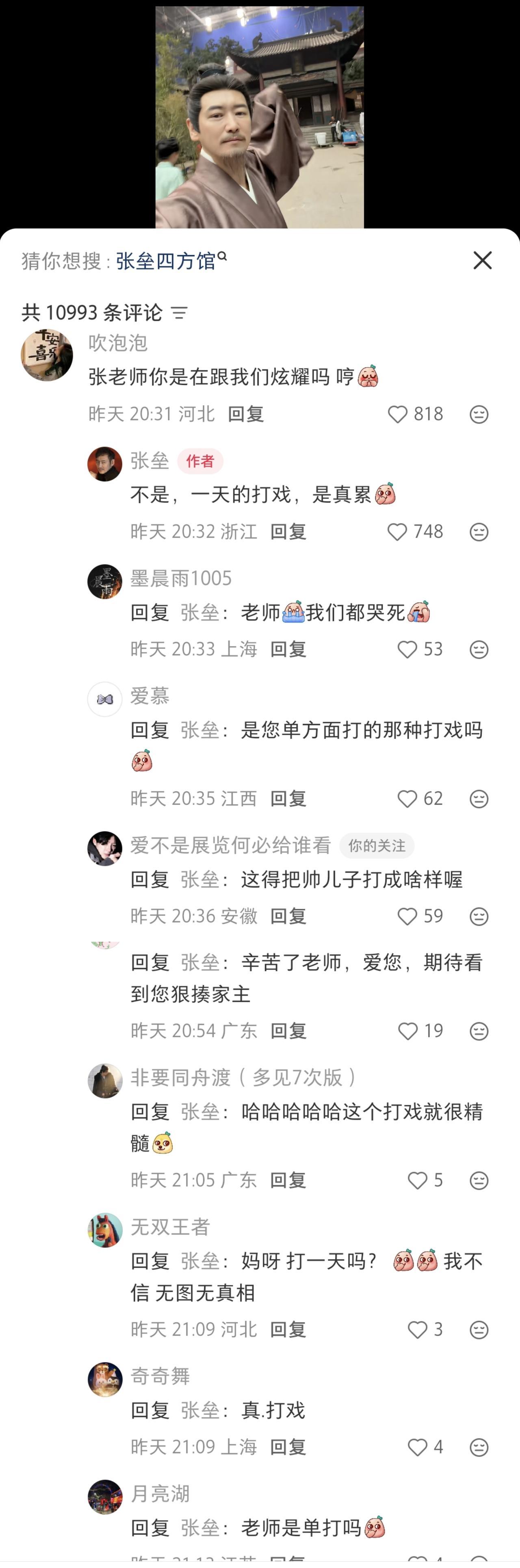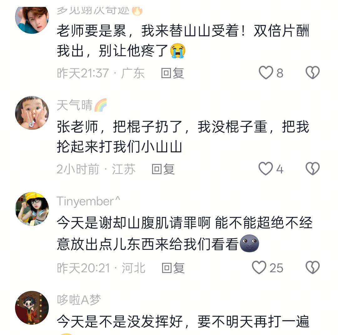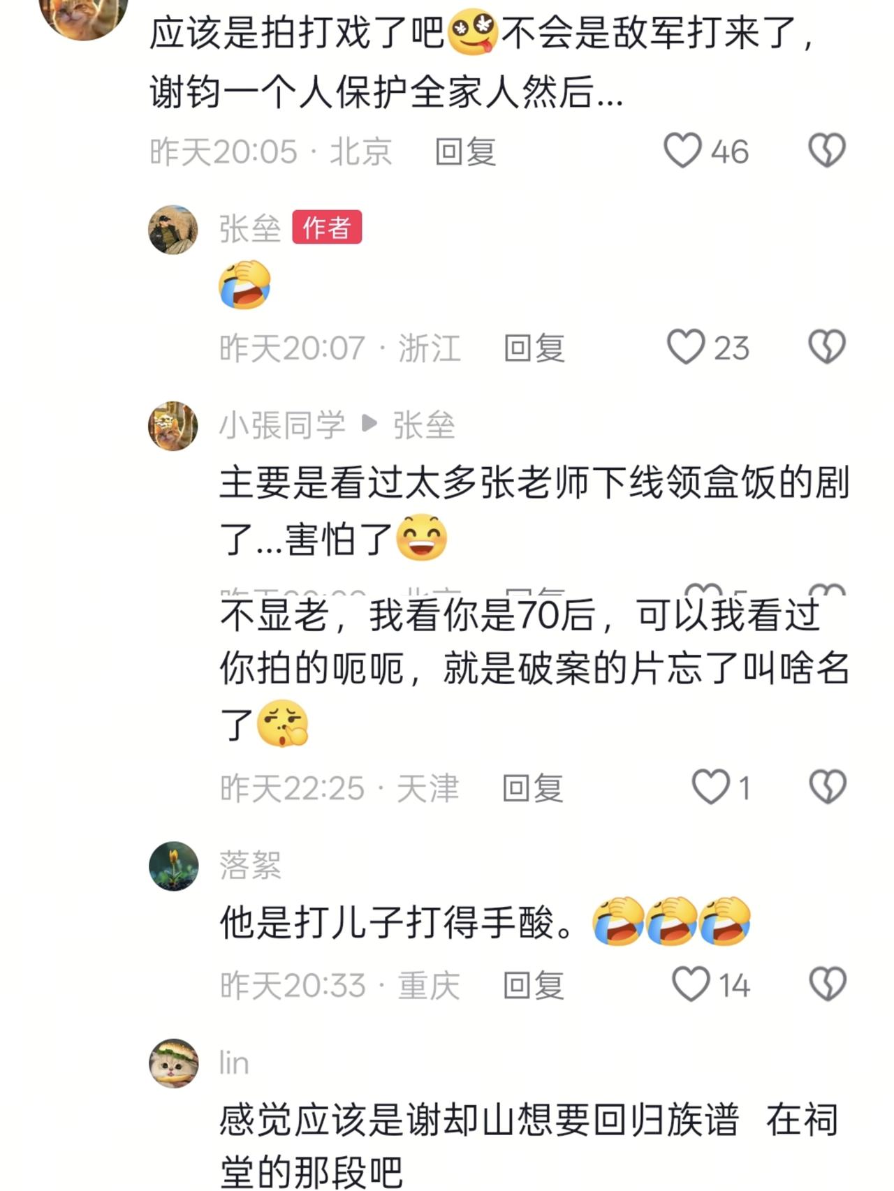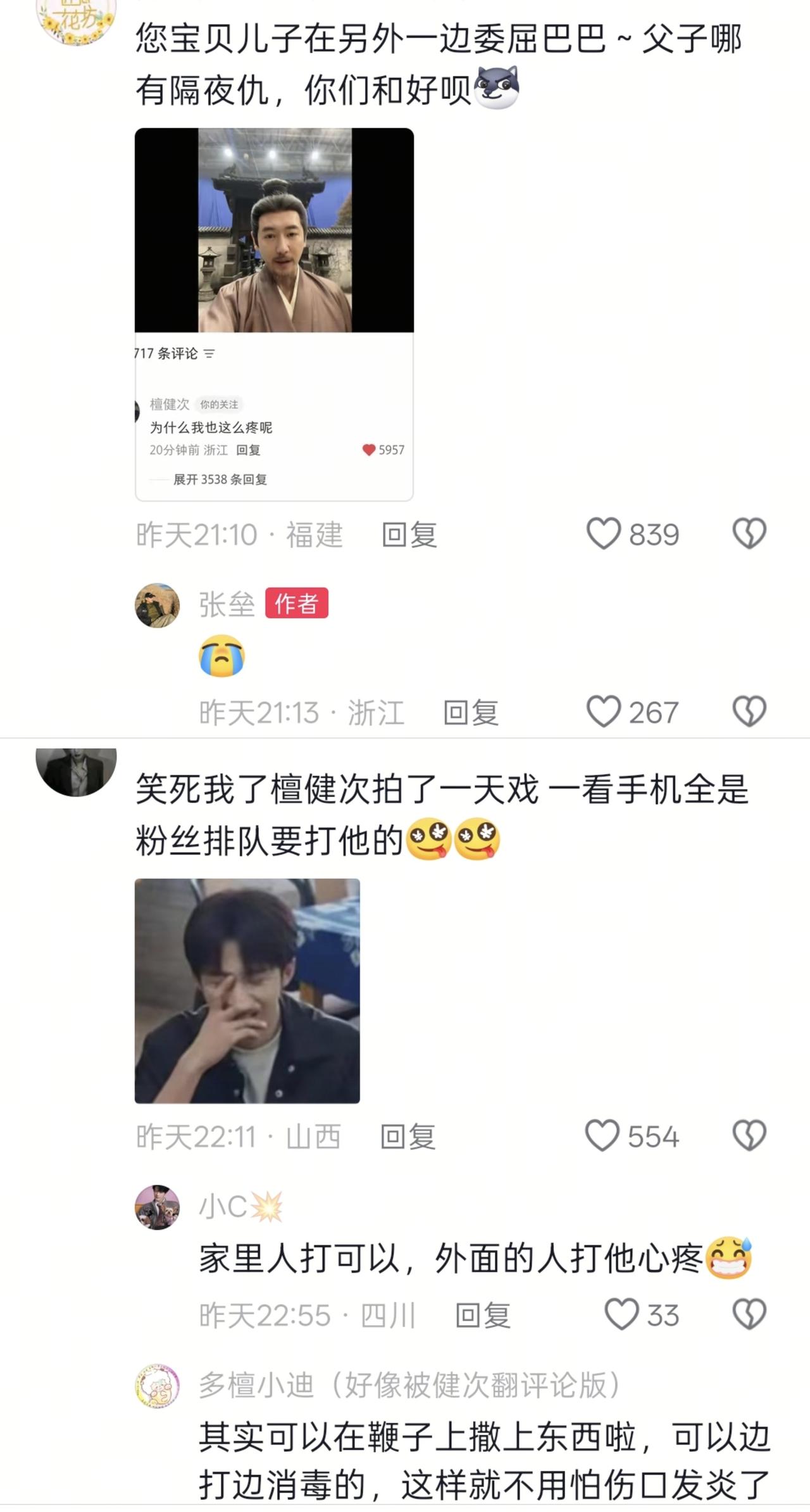 昨天饰演谢却山爹爹的张垒老师发了个视频说这场戏拍的他胳膊酸疼,应该就是关于家法的戏份,檀健次点开评论区本来想来“告状”的,以为檀丝都在心疼他,结果一看全是排队要帮忙打几棍子的,求檀老师心理阴影面积!