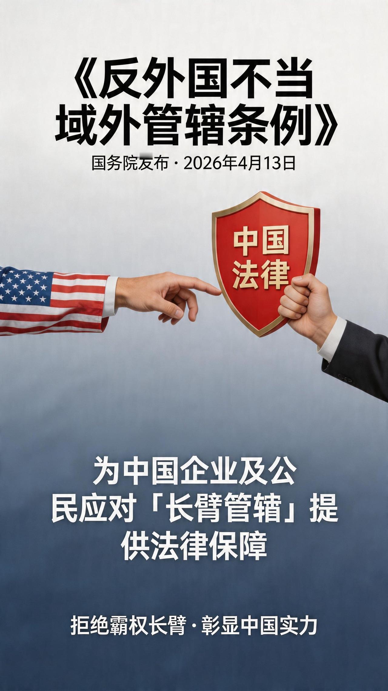 4月13日,国务院发布《反外国不当域外管辖条例》,为中国企业及公民应对“长臂管辖”提供法律保障。