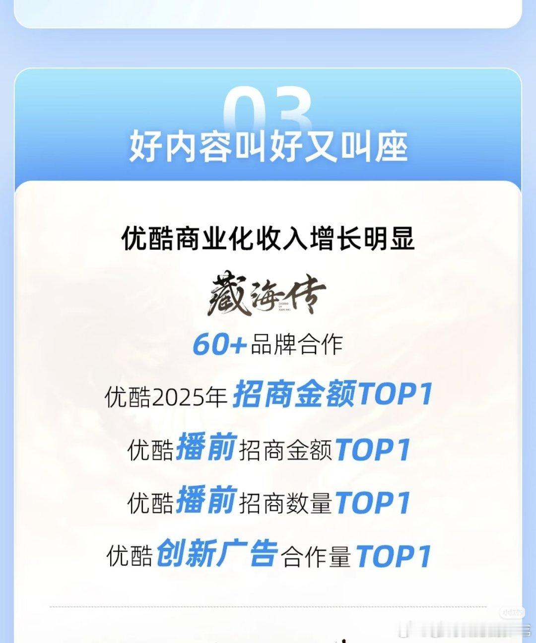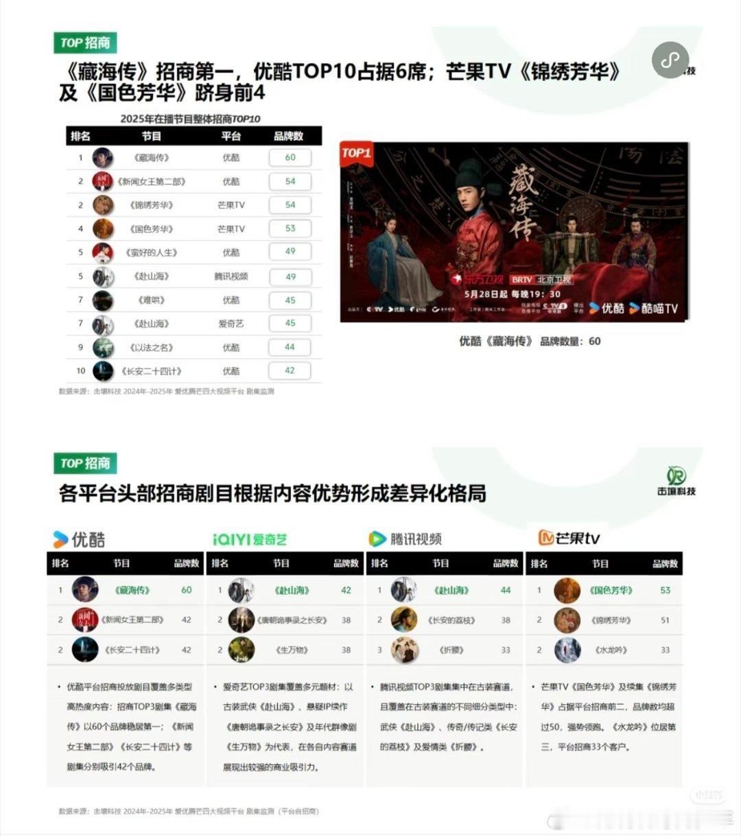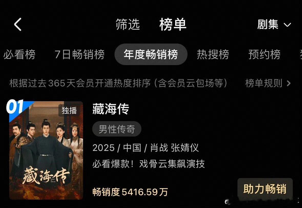 肖战十日终焉带火双城文旅藏海传不仅是优酷全年收入最高峰值,还是优酷拉新史冠,招商金额年冠、招商数量史冠同时也是优酷海外全球版权卖出最多的剧集藏海传达成多项平台史冠佳绩!藏海传冠名费超过一亿 15秒贴片900万创下优酷金额记录 其他剧集15秒最多128万 专业广告数据机构发布长剧市场报告:2025年全平台招商年冠~藏海传 !无限定词!全平台第一!这可是优酷自己说的热知识:藏海传不是暑期播的剧,5月18日,冷档期播出,20天播完,超强长尾效应延续到暑期,成为暑期全平台古装剧播放量第一肖战十日终焉带火双城文旅 藏海传