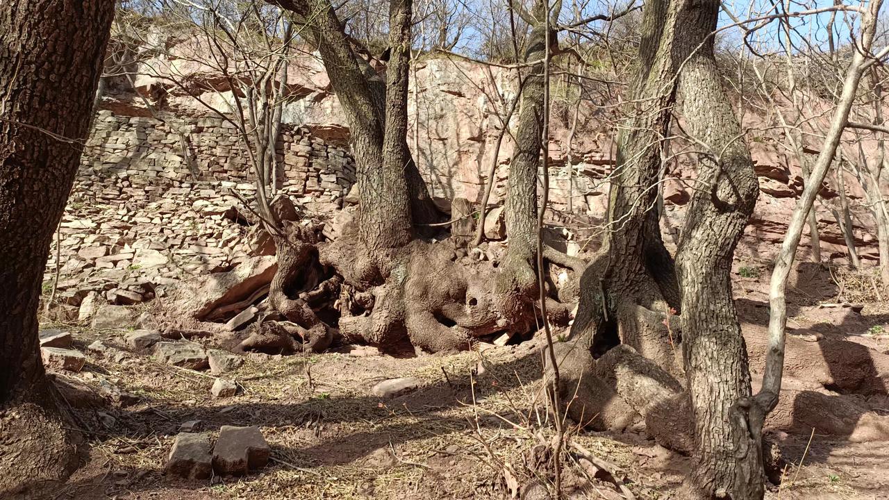 在李家岩村小庙旁的山崖上,长着一棵榔榆树,老人们都说,榔榆树的后方有一道山缝,隔着缝隙能听到山里传来呼呼的声响。传说这声响,正是那头没被南方术士偷走的金牛,驮着一盘金磨在磨金豆,整座大山的内部都是空心的,声响就是金磨转动发出来的。
