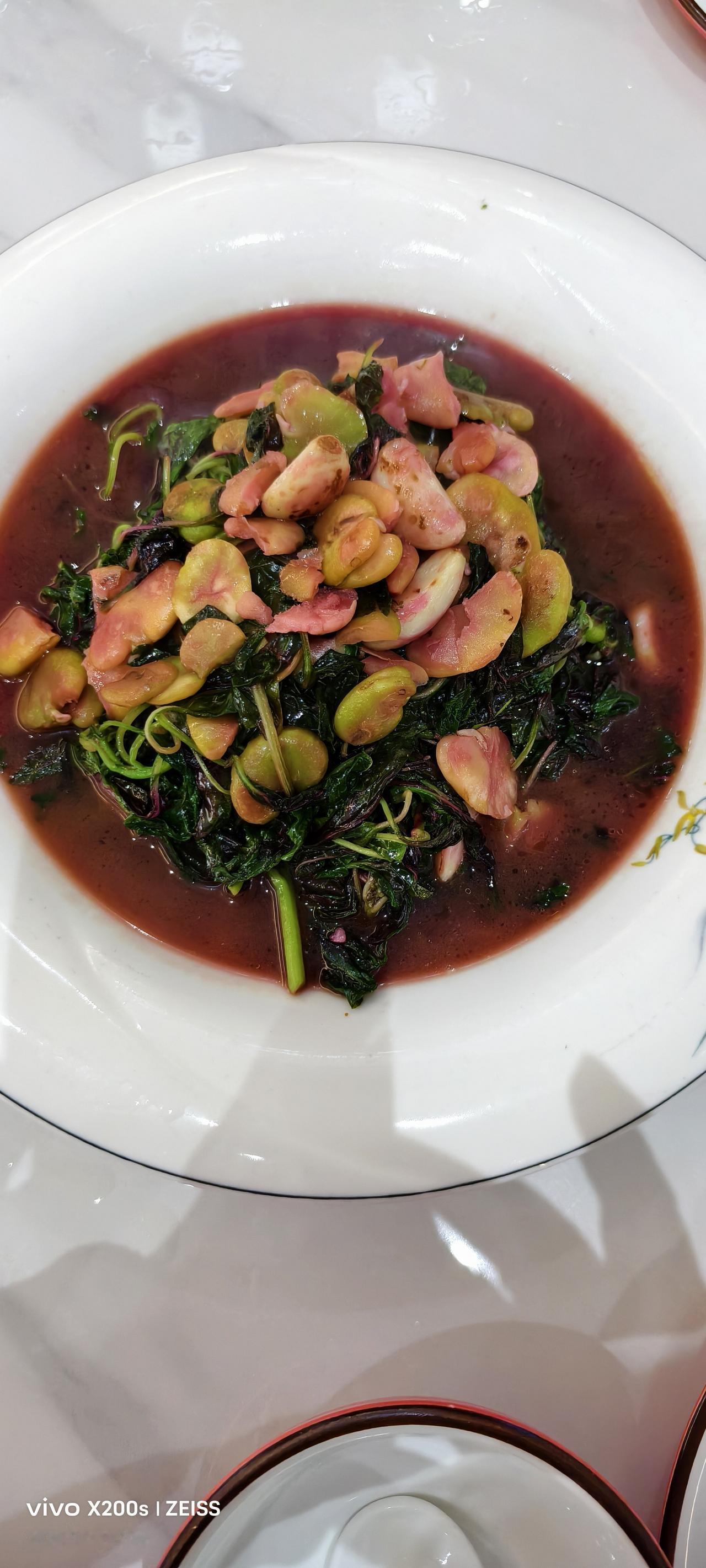 老伴细心地挑了一块给我,自己却专攻那盘苋菜炒蚕豆瓣,紫红的苋菜汁水浸着碧绿的豆瓣,是镇江人春天最家常的时令菜。