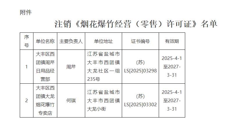 盐城市大丰区应急管理局发布公告,因大丰区西团镇周芹日用品经营部、大丰区西团镇大龙烟花爆竹专卖店主动终止烟花爆竹经营活动,依据相关规定,决定注销两家单位的《烟花爆竹经营(零售)许可证》,并公示了注销名单!
