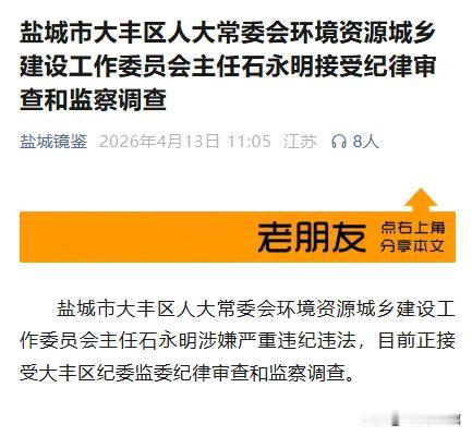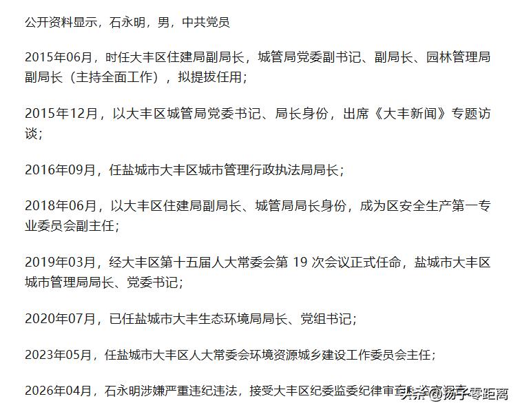 据盐城镜鉴消息,盐城市大丰区人大常委会环境资源城乡建设工作委员会主任石永明涉嫌严