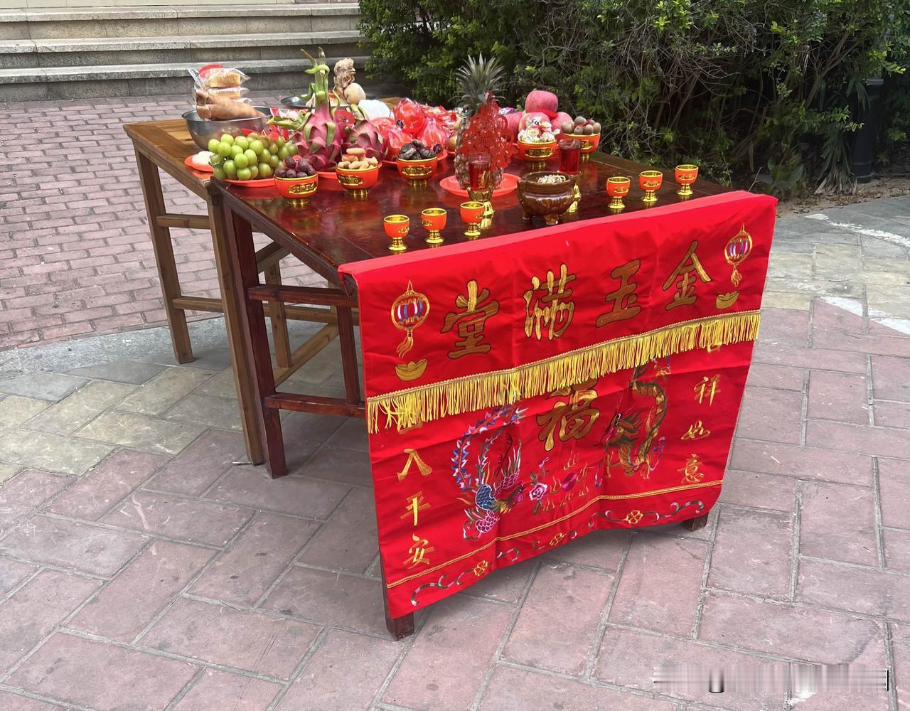 穿红衣服的女人,三三两两围在供桌边,虔诚地做着仪式。