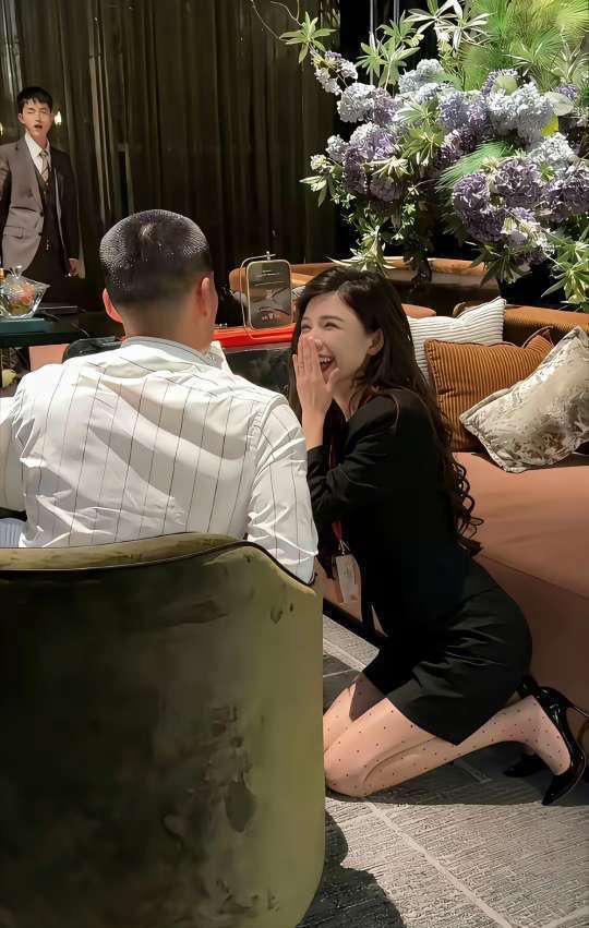大约聊了许久,女士或许是半跪的姿势太累,便换成全跪的姿势,继续与男士交谈。只见女士捂着嘴巴开心地大笑起来,打破了原本严肃的氛围。