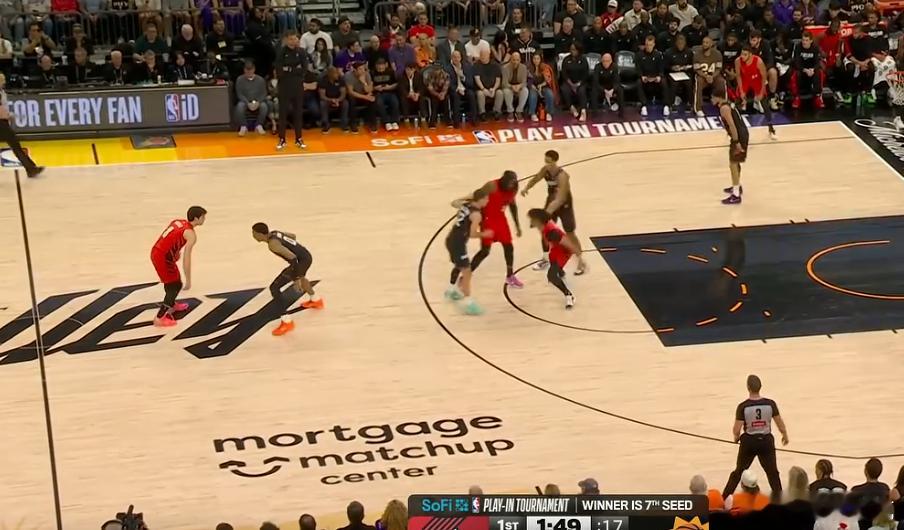 123456阿夫迪亚LOGO位置持球,开拓者阿夫迪亚、夏普、罗威三人上线发动小组战术配合:夏普无球跑动佯攻作为战术起手式,阿福先是佯装走左路突破误导防守,随后迅速使用“胯下变向”+前脚“挖步”与罗威衔接挡拆配合,启动右路突破。完全摆脱追防的邓恩后挡拆行进间面对防挡拆守“高位沉退”/“GAP”位沉退的伊戈达罗加速突破篮下,直接撞飞伊戈达罗强硬上篮打进。