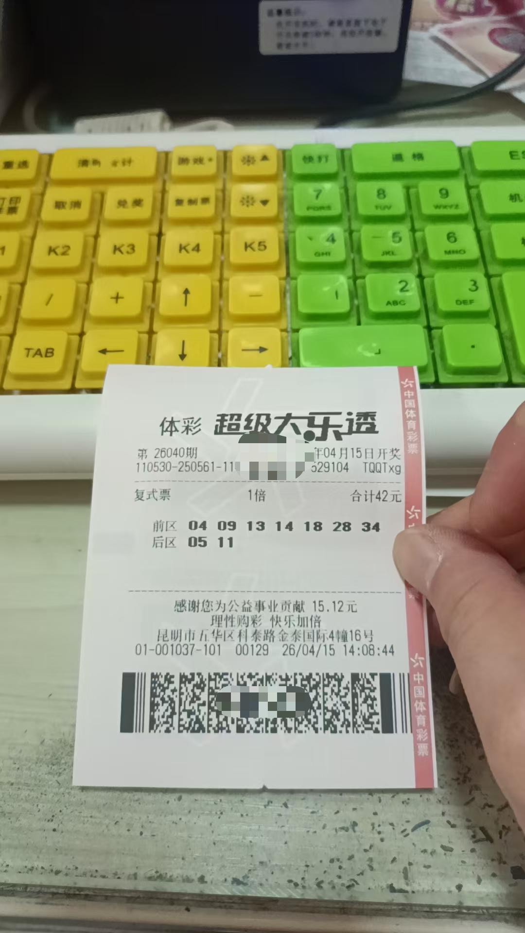 4月15日大乐透实票晒出 昨晚双色球中2+0[黑脸]还好就小注28元。 今天大乐