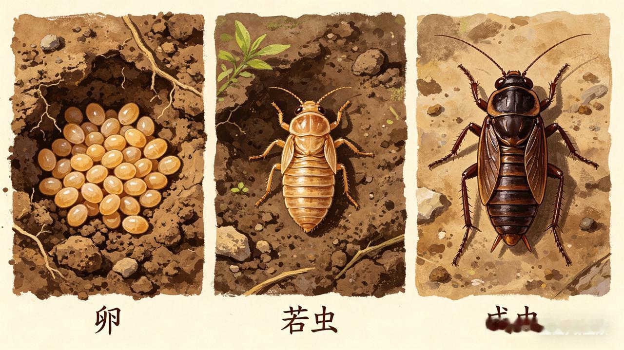 简单记:卵 → 小蝼蛄(若虫)→ 大蝼蛄(成虫),没有蛹,越长大越能打洞。