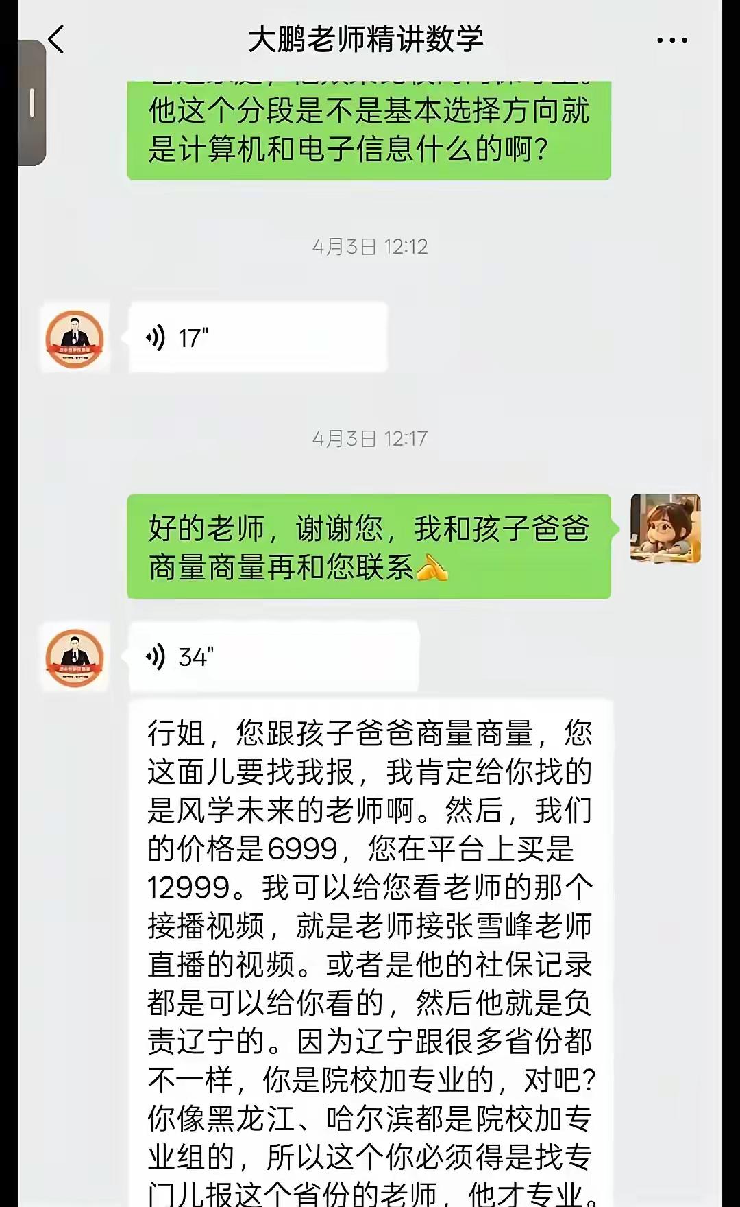 是离职的那位老师与家长的聊天记录,他们聊天内容是老师说在平台买的课太贵,然后联系他,差价不是一星半点,而差了将近一半,不知道截图的可信度是多少,也不知道是那位离职老师离职前还是离职后?