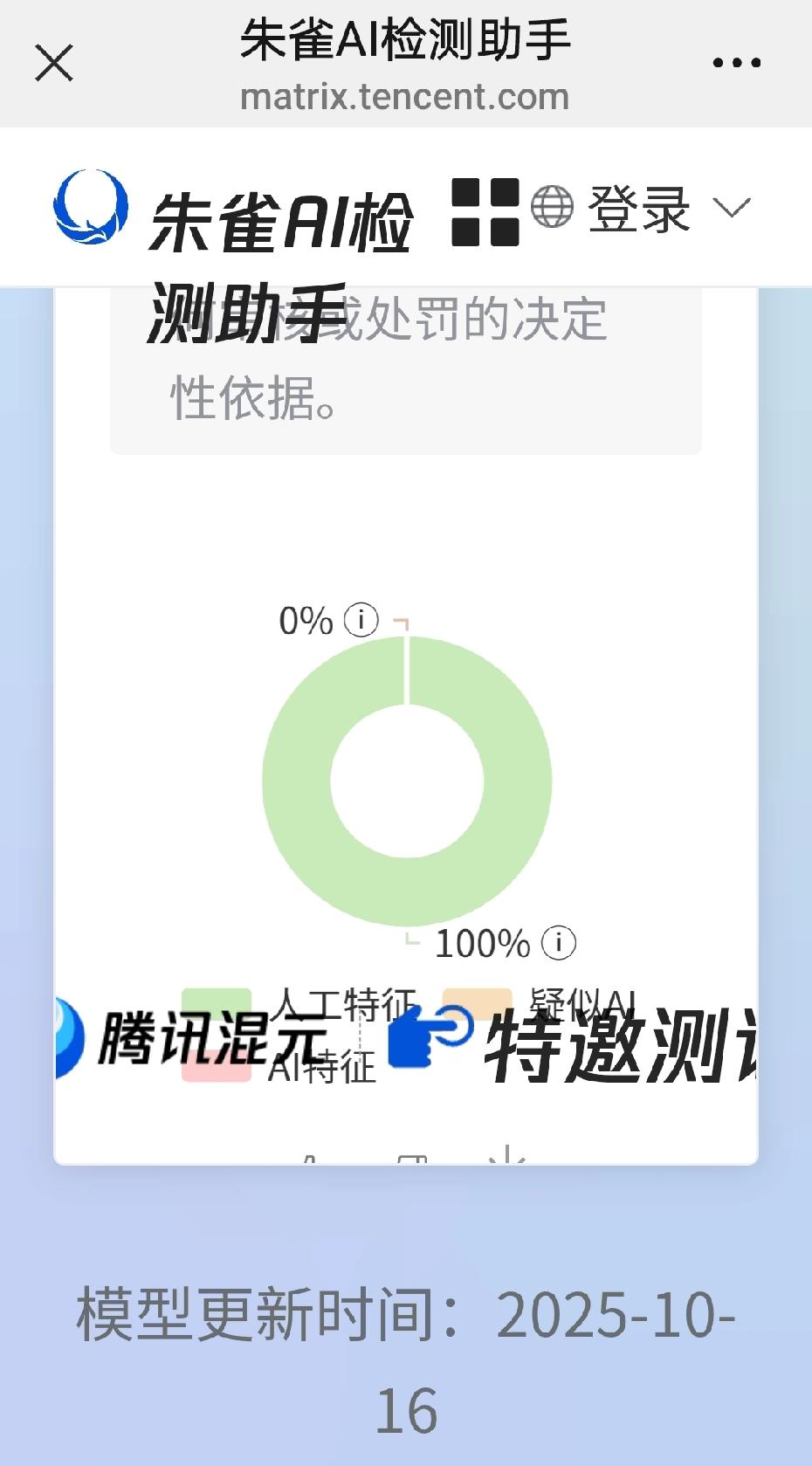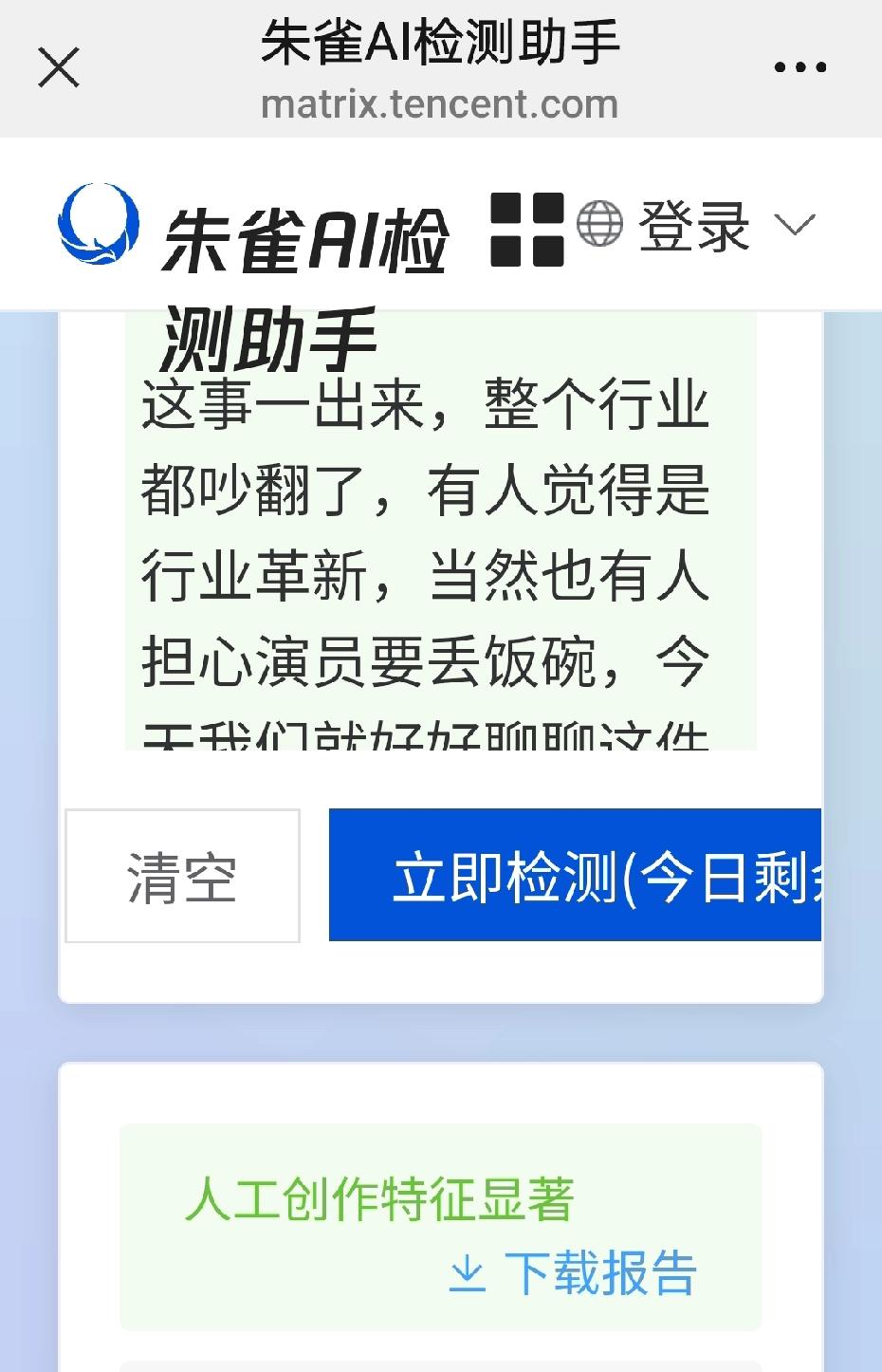 今天为了用朱雀检测我的作品是不是人工创作,连家人的微信都用上了,没有办法,每个微信每天只有5次机会。