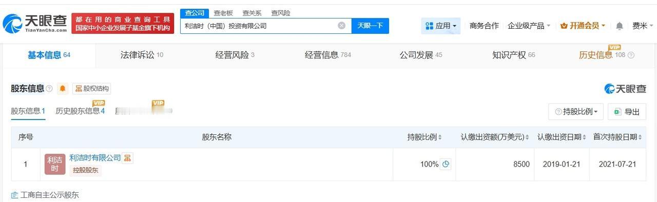天眼查App显示,滴露关联公司利洁时(中国)投资有限公司成立于2014年1月,法定代表人为黄玮,注册资本8500万美元,经营范围包括以自有资金从事投资活动、机械设备销售、办公设备销售等,由利洁时有限公司全资持股。法律诉讼信息显示,该公司曾涉及合同纠纷、虚假宣传纠纷等案件。