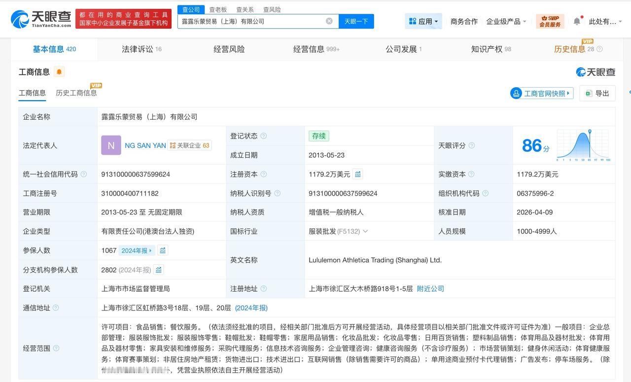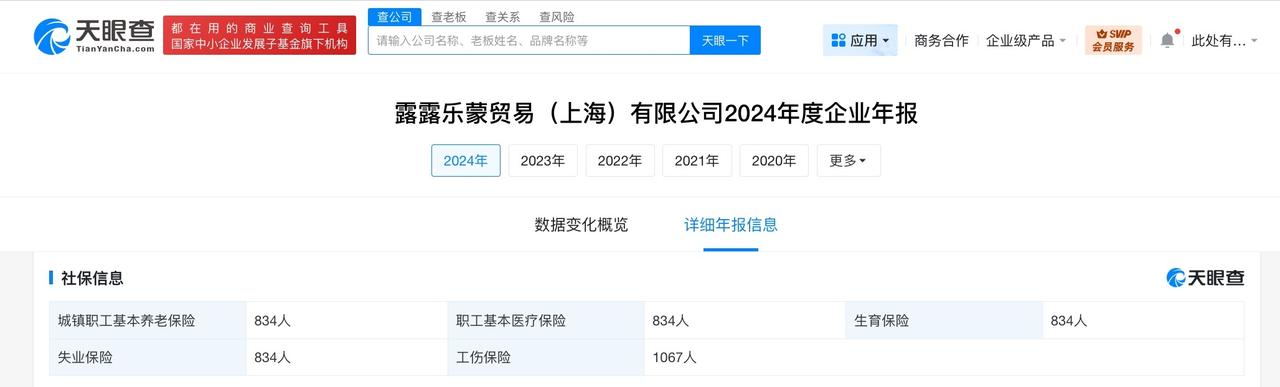 天眼查App显示,Lululemon中国关联公司露露乐蒙贸易(上海)有限公司成立于2013年5月,法定代表人为NG SAN YAN,注册资本1179.2万美元,经营范围包括食品销售、餐饮服务、企业总部管理等。股东信息显示,该公司由LULULEMON HK LTD.全资持股。风险信息显示,该公司曾涉及多起诉讼,案由涉及买卖合同纠纷、产品责任纠纷等。值得一提的是,年报信息显示,2016年至2024年,该公司参保人数8年涨近40倍。