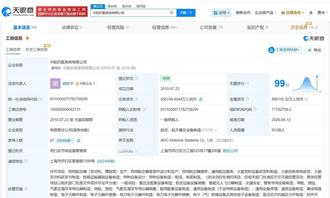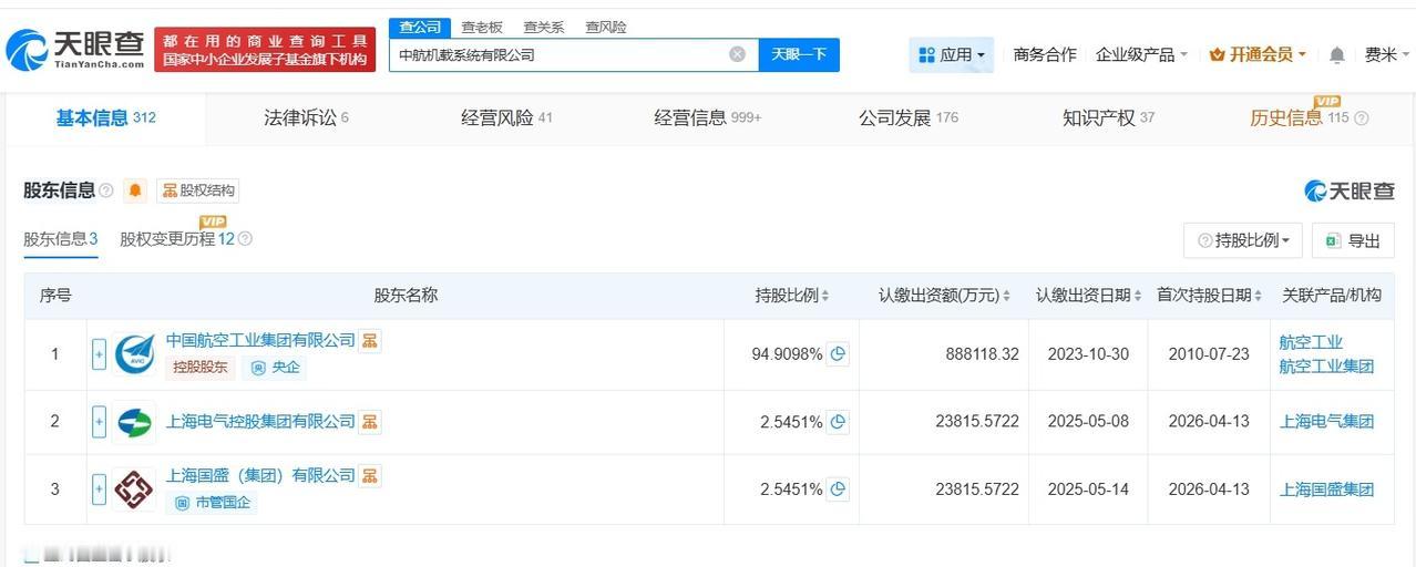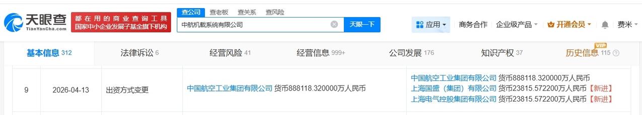天眼查App显示,近日,中航机载系统有限公司发生工商变更,王建刚卸任法定代表人,由胡林平接任,新增上海国盛(集团)有限公司、上海电气控股集团有限公司为股东,同时,注册资本由约88.8亿人民币增至约93.6亿人民币。