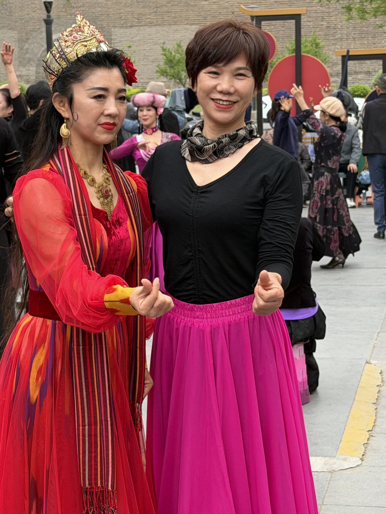 在西安,教新疆舞的美女阿瓦古丽和帅哥艾力老师,专程来现场激情表演,欢迎远道而来的外地舞友。