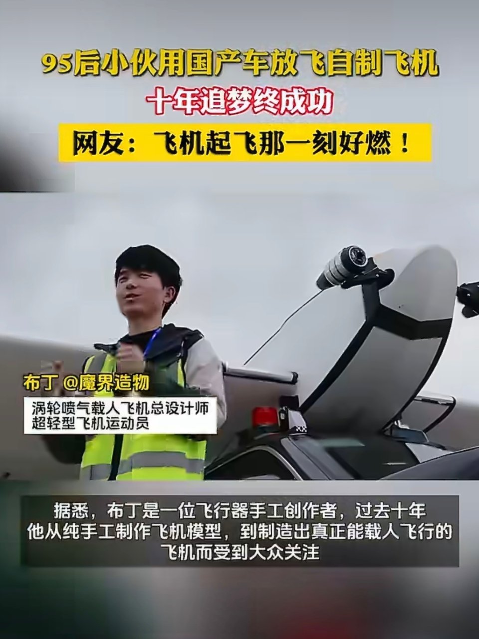 95后小伙用国产车抛飞载人飞机梦想照进现实的故事,江西95后小伙布丁十年追梦,从