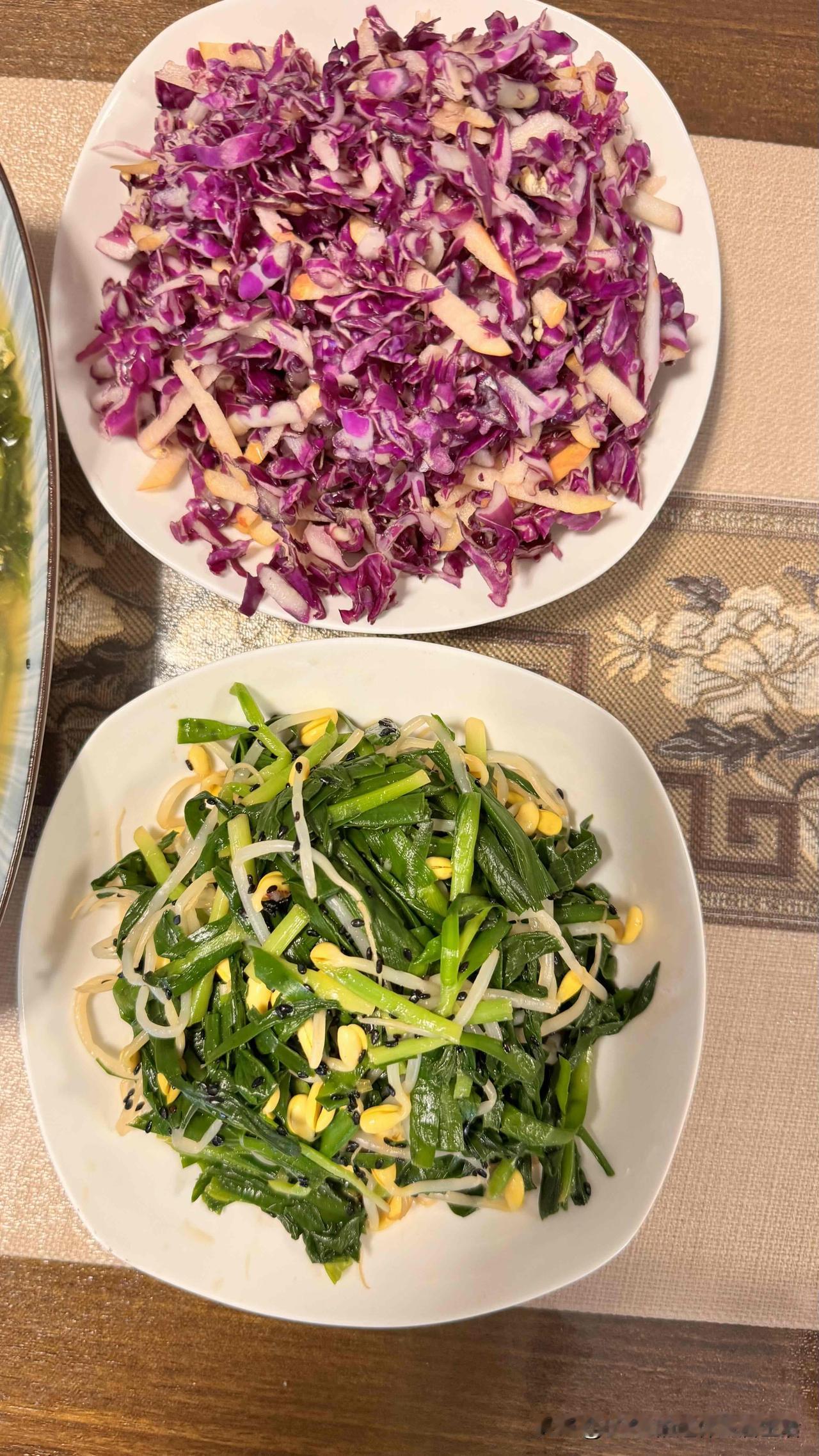 生菜叶一盆,焯水芹菜,焯水韭菜豆芽淋苏子油,苹果拌紫甘蓝,盐卤香椿芽淋芝麻油,蛤蜊汤煮鸡蛋菠菜汤,杂菜豆面团。以上蔬菜除豆芽外均产自小院。