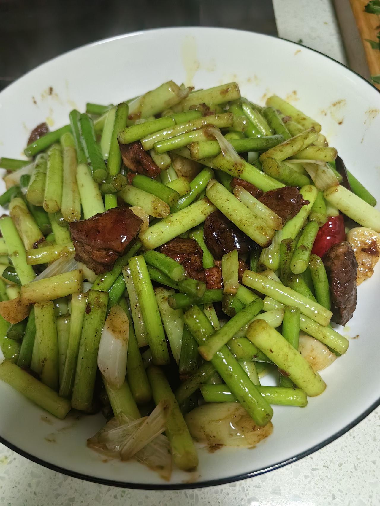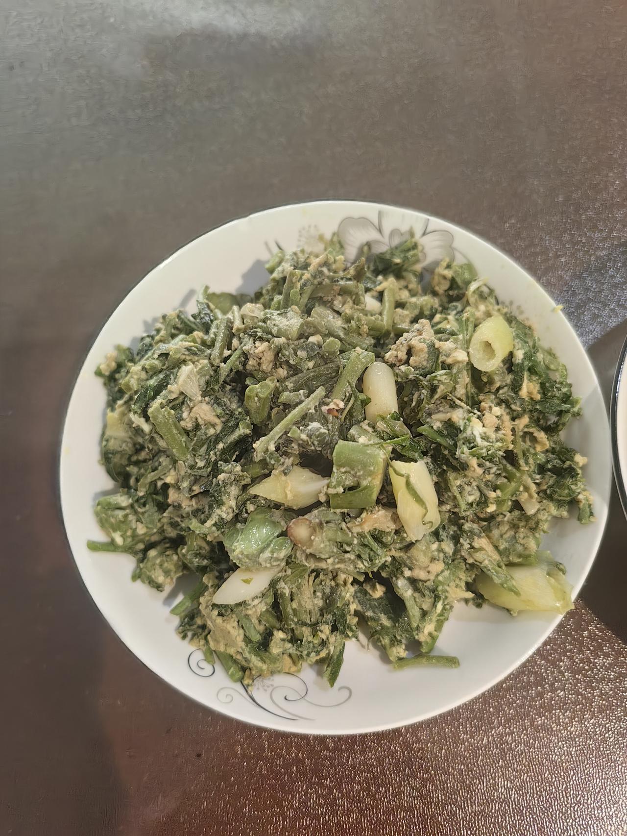 随后我系上围裙进了厨房,开火炒菜。先炒一盘蒜薹炒肉,肉片煸炒出油,蒜薹下锅大火快炒,简单调味,鲜香扑鼻。紧接着再炒香椿炒鸡蛋,金黄的鸡蛋裹着嫩绿的香椿,香气浓郁,家常又下饭。不多时,两盘热气腾腾的菜就端上了桌。