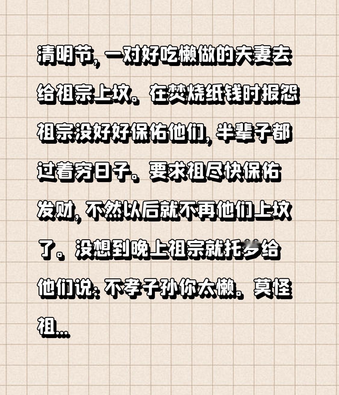 清明节,有一对好逸恶劳的夫妻去给祖宗上坟。焚烧纸钱时,他们抱怨祖宗没好好庇佑他们,让自己半辈子都在穷苦中度过。还要求祖宗赶紧保佑他们发财,不然以后就不再给他们上坟了。
