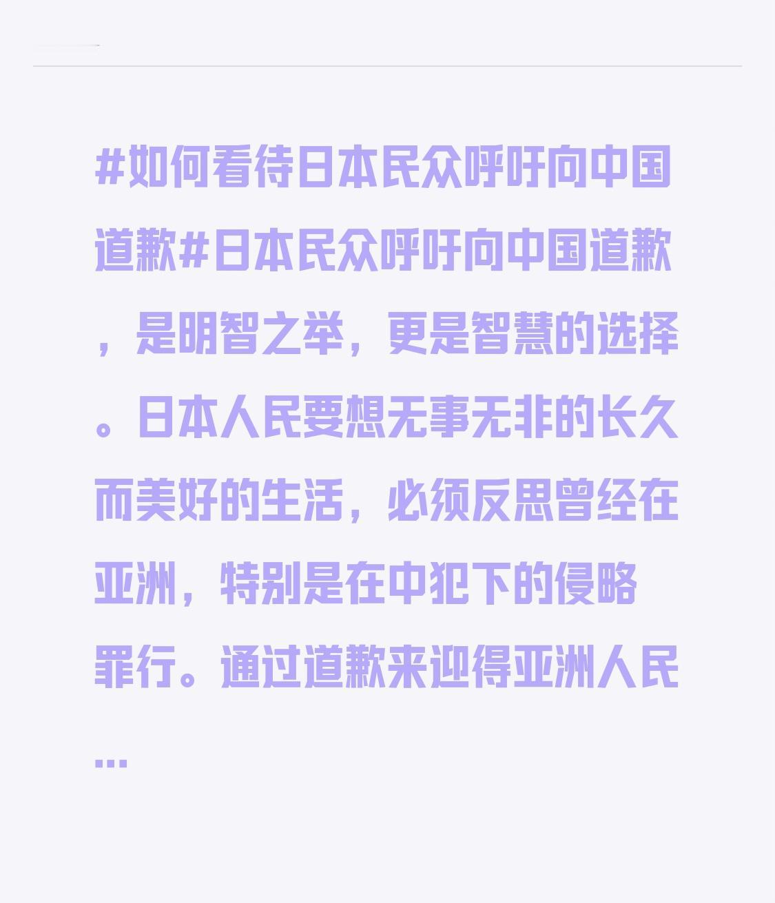 如何看待日本民众呼吁向中国道歉日本民众呼吁向中国道歉,是明智之举,更是智慧的选择。日本人民要想无事无非的长久而美好的生活,必须反思曾经在亚洲,特别是在中国犯下的侵略罪行。通过道歉来赢得亚洲人民,特别是中国人民的谅解,铲除军国主义滋生的土壤,与亚洲各国人民友好相处,是他们唯一的正确选项。抱美国的大腿,跪舔美国,挑衅中国,与亚洲人民为敌,特别是与中国为敌,日本必将有灭国之厄!