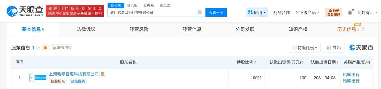 天眼查App显示,近日,厦门哈选网络科技有限公司成立,法定代表人为尹航,注册资本100万人民币,经营范围包括机械设备租赁、共享自行车服务、物联网应用服务、物联网技术服务、物联网技术研发、信息系统集成服务、互联网销售等。股东信息显示,该公司由上海哈啰普惠科技有限公司全资持股。