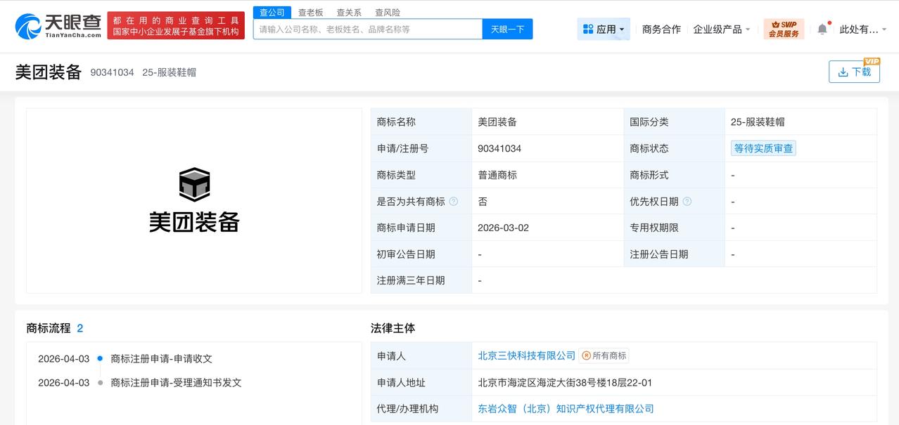 天眼查知识产权信息显示,近日,美团关联公司北京三快科技有限公司申请注册两枚“美团装备”商标,国际分类涉及皮革皮具、服装鞋帽,当前商标状态均为等待实质审查。