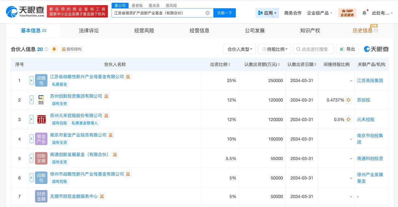 天眼查App显示,近日,江苏省增资扩产战新产业基金(有限合伙)成立,执行事务合伙人为江苏高投创业投资管理有限公司,出资额100亿人民币,经营范围为股权投资、以自有资金从事投资活动。合伙人信息显示,该基金由江苏省战略性新兴产业母基金有限公司、苏州创新投资集团有限公司、苏州元禾控股股份有限公司、南京市紫金产业投资有限公司等共同出资。