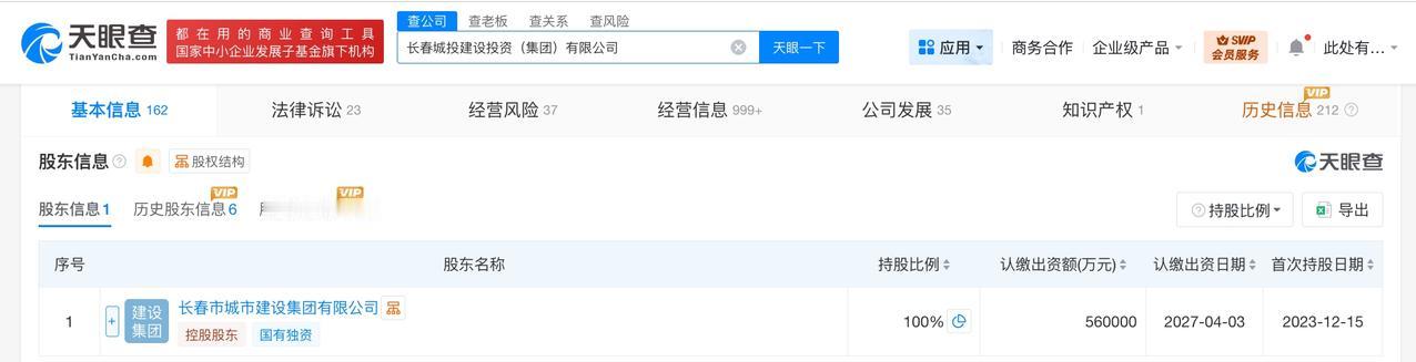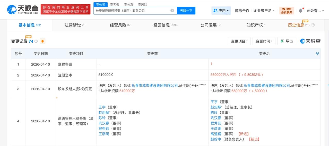 天眼查工商信息显示,近日,长春城投建设投资(集团)有限公司发生工商变更,注册资本由51亿人民币增至56亿人民币,增幅约10%,同时,部分高管发生变更。