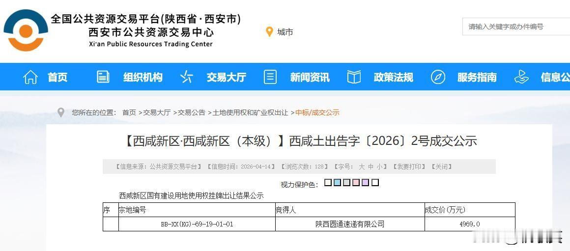 4月14日,西安公共资源交易中心发布《【西咸新区·西咸新区(本级)】西咸土出告字〔2026〕2号成交公示》,内容显示: