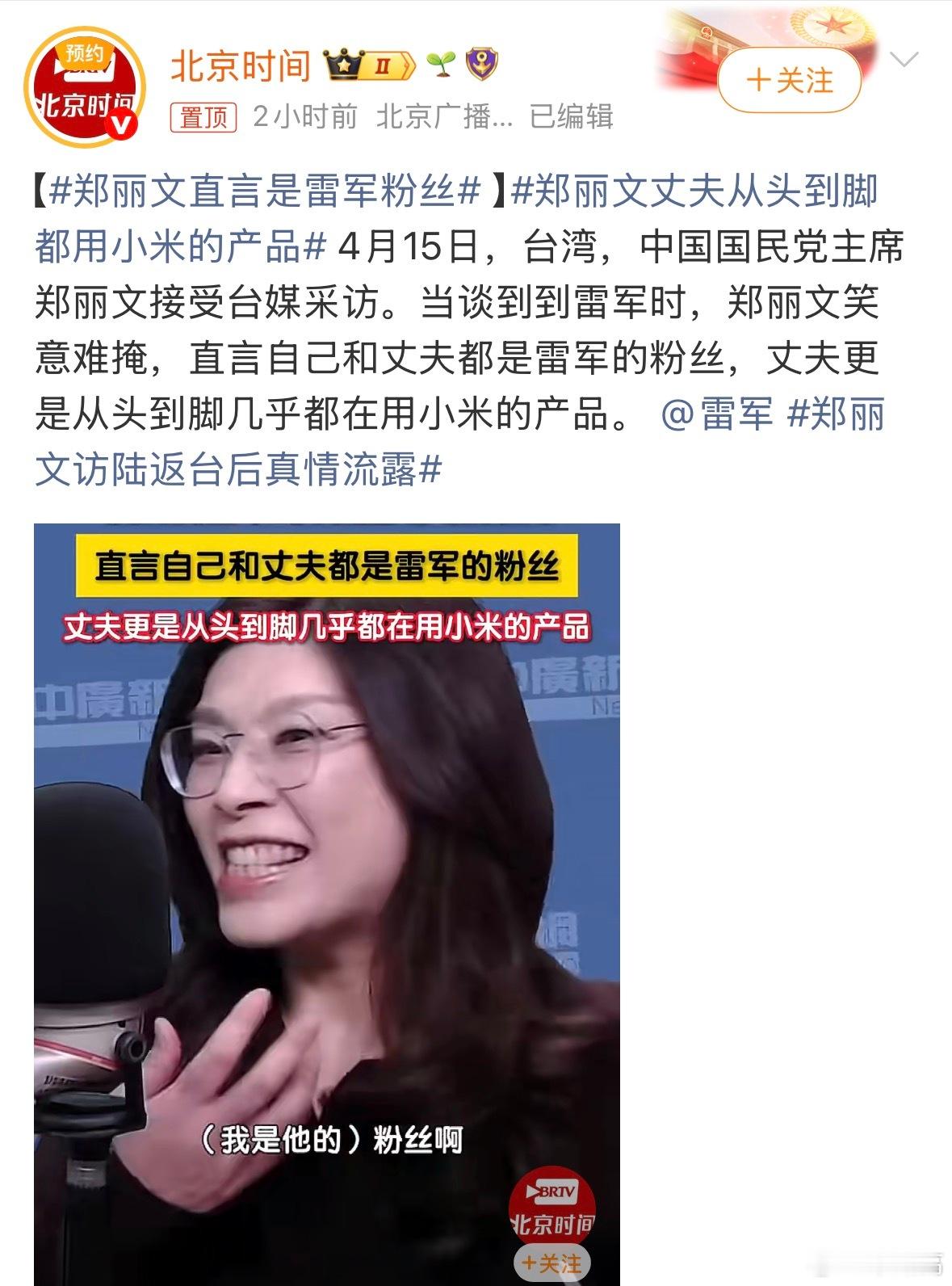 大家会因为喜欢同一个品牌而聊到一起,会发现原来两岸的审美、消费习惯这么接近,这么看来,大家对好产品、欣赏优秀企业家的态度都一样。郑丽文直言是雷军粉丝