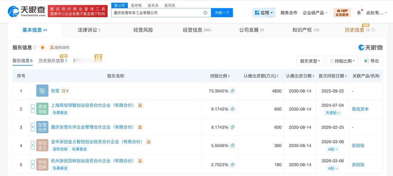 天眼查App显示,张雪机车关联公司重庆张雪机车工业有限公司成立于2024年4月,法定代表人为张雪,注册资本6540万人民币,实缴资本1200万人民币,经营范围含道路机动车辆生产、汽车零配件零售、汽车零部件再制造、摩托车及零配件零售、摩托车及零部件研发等,由张雪,上海高信领智创业投资合伙企业(有限合伙)、重庆张雪伙伴企业管理合伙企业(有限合伙)等共同持股。
