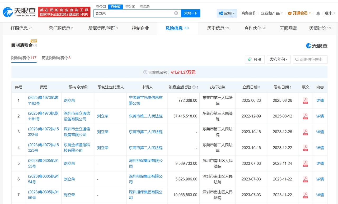 天眼查App显示,刘立荣名下关联20余家企业,其中10余家企业处于存续状态,包括金立(重庆)科技有限公司、深圳市金立通信设备有限公司、深圳市朵唯科技有限公司等,刘立荣在上述企业担任董事长、总经理等职务,其他企业已被吊销或注销。风险信息显示,刘丽荣现存多条股权冻结、失信被执行人(老赖)、限制消费令及终本案件信息。