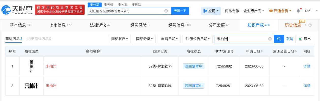知识产权信息显示,该公司已申请注册多个“宋柚”“汉柚”等商标,国际分类涉及运输工具、医药、广告销售等,商标状态多为已注册。值得注意的是,该公司注册的“宋柚汁”商标均已被驳回。标准信息显示,该公司曾参与起草“衢州味道 双柚汁”等团体标准文件,目前上述标准状态均为现行。