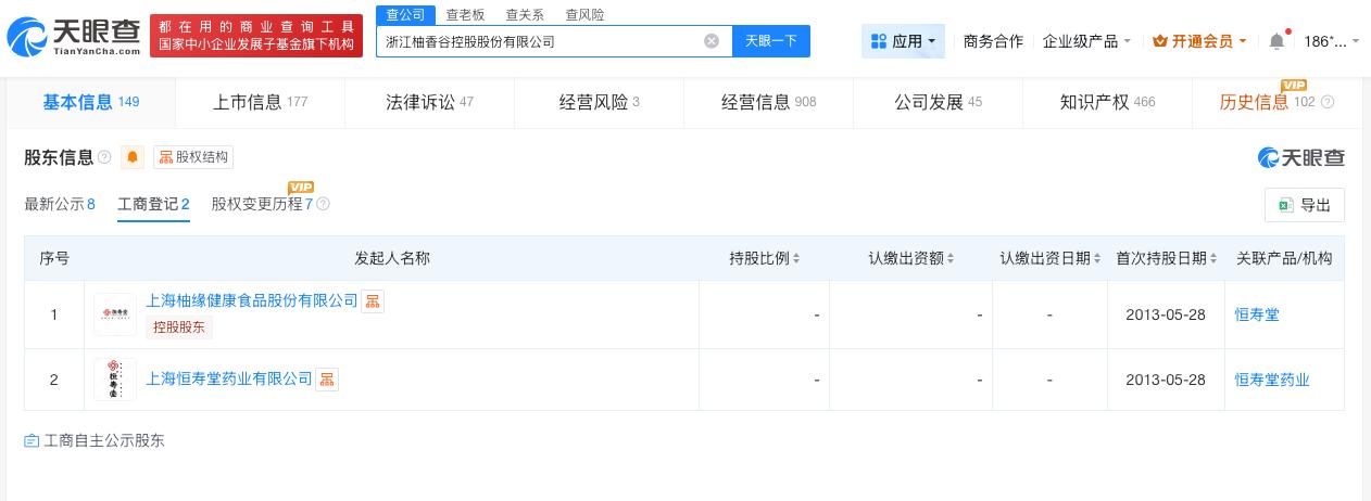 天眼查App显示,宋柚汁产品关联公司浙江柚香谷控股股份有限公司成立于2013年5月,法定代表人为宋伟,注册资本3750万人民币,经营范围包括控股公司服务、食品销售、货物进出口、食用农产品初加工等。股东信息显示,该公司由上海柚缘健康食品股份有限公司等共同持股。