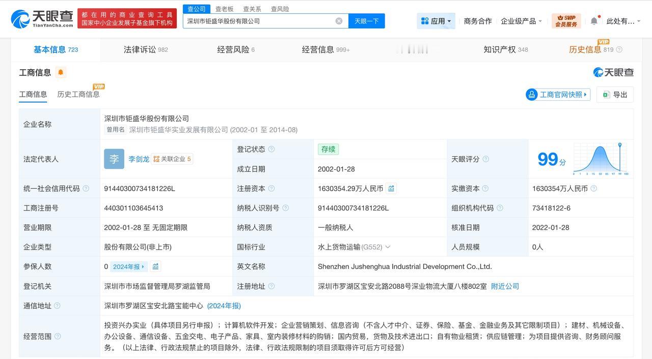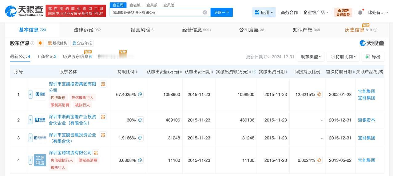 深圳市鉅盛华股份有限公司成立于2002年1月,法定代表人为李剑龙,注册资本约163亿人民币,经营范围含投资兴办实业,计算机软件开发,企业营销策划、信息咨询等。股东信息显示,该公司由深圳市宝能投资集团有限公司、深圳市浙商宝能产业投资合伙企业(有限合伙)、深圳市宝能创赢投资企业(有限合伙)、深圳宝源物流有限公司共同持股。