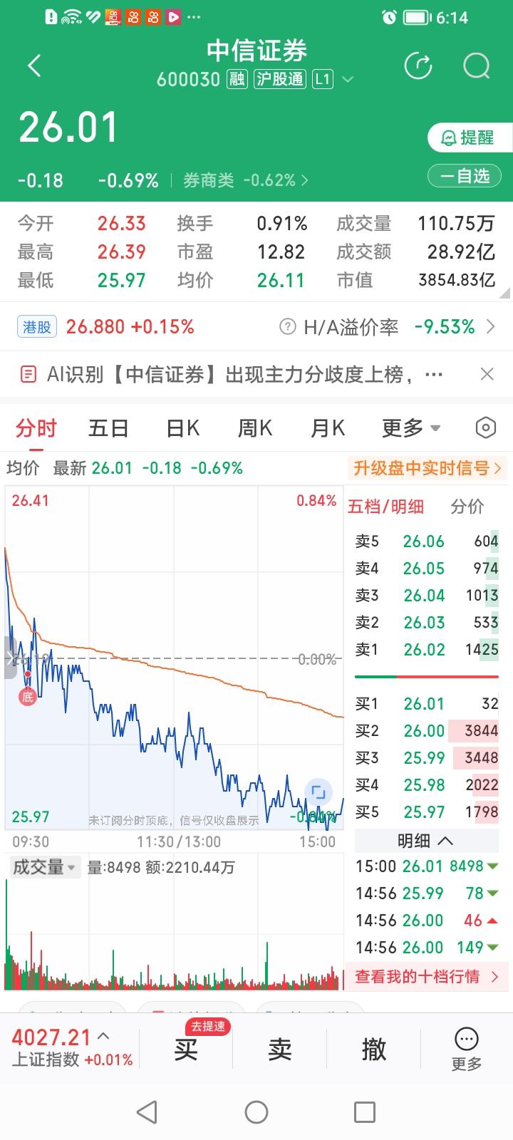 中信证券,今天收盘下跌0.69%,涨幅居券商股涨幅榜第二十八名。这俩头部券商股市值一哥和二哥今天股价高开低走,一路向东对大盘走软居功至伟。