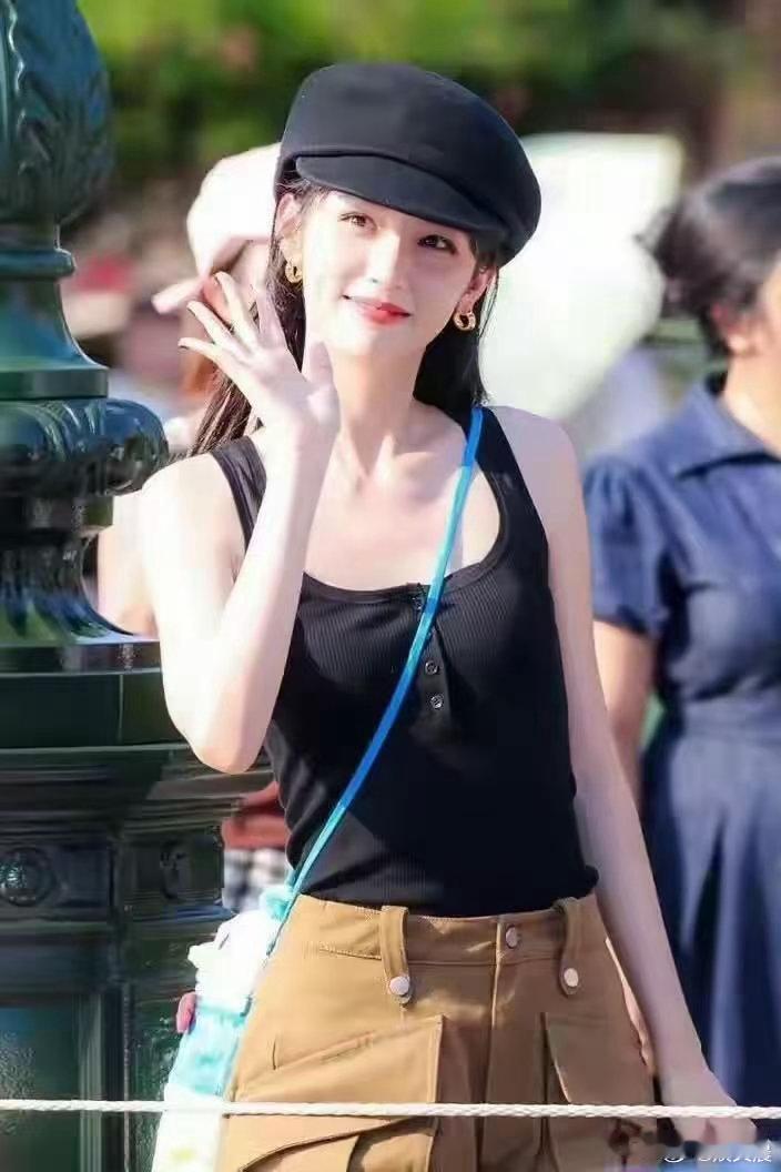 周也头戴黑色帽子,简约黑背心搭配驼色短裤,穿搭清爽利落,气场满满,氛围感十足,妥妥精致女明星气质